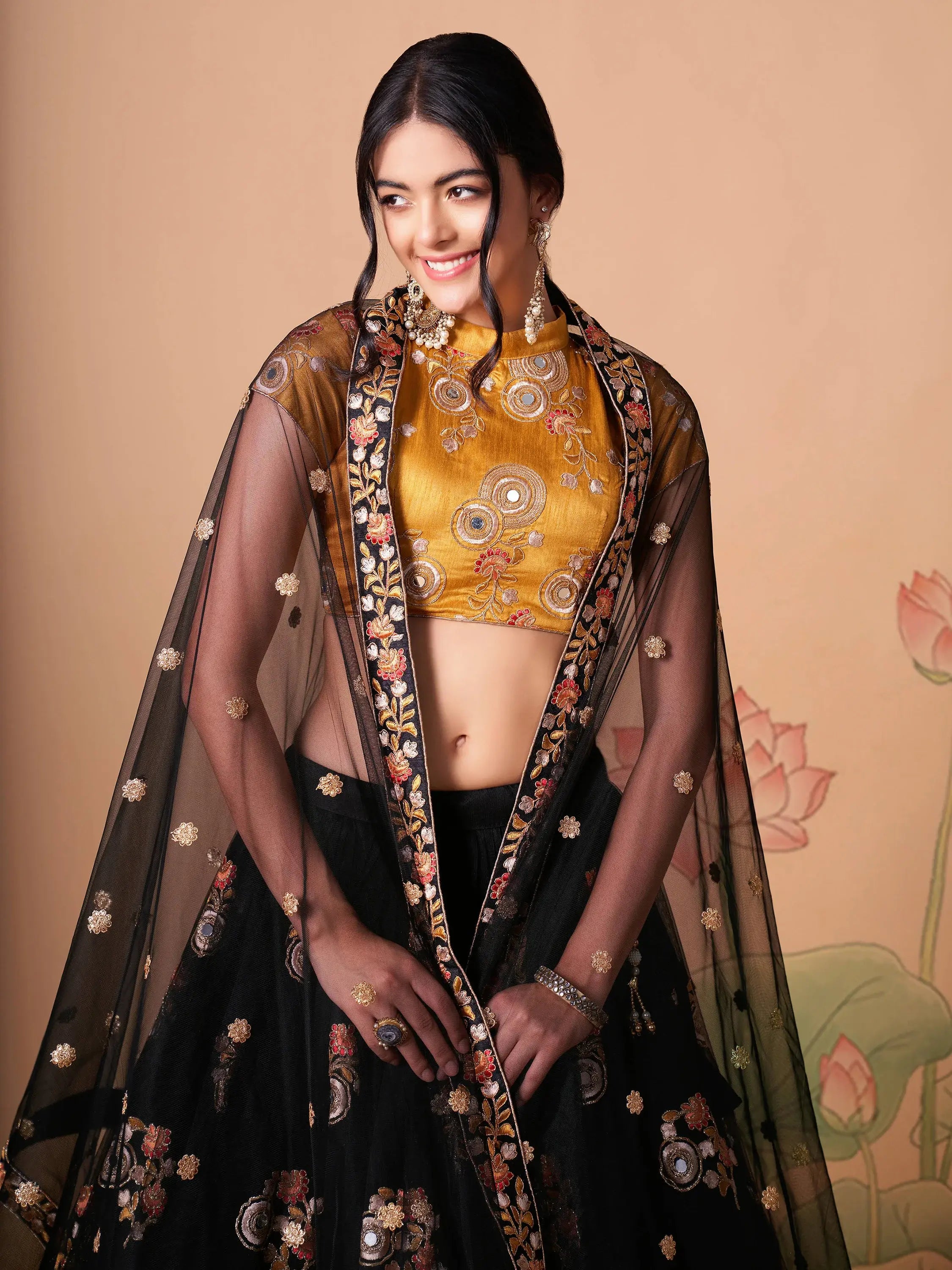 The featured black lehenga is paired with golden yellow silk choli decked up with colored embroidery, sequins, and a mirror on it.