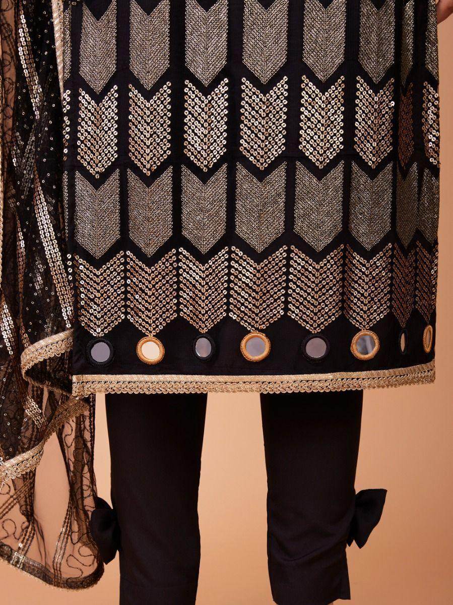 Steal everyone's heart and attention by wearing this dazzling black color suit made with butterfly net material accomplished with all over tone to-tone thread work and sequin work embroidery with original mirror work and readymade fancy lace with american crape inner fabric.