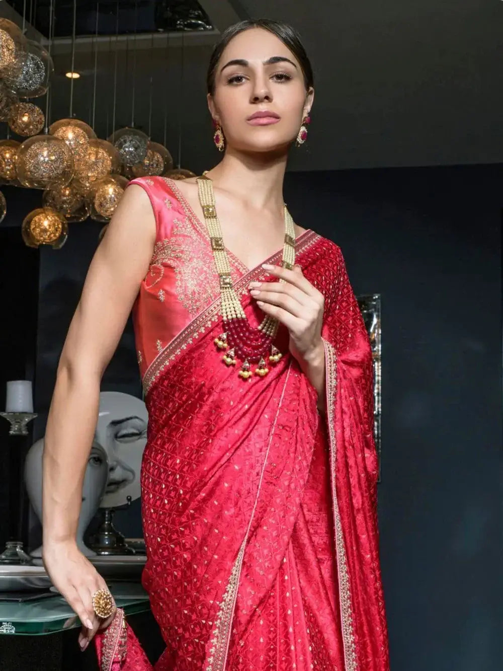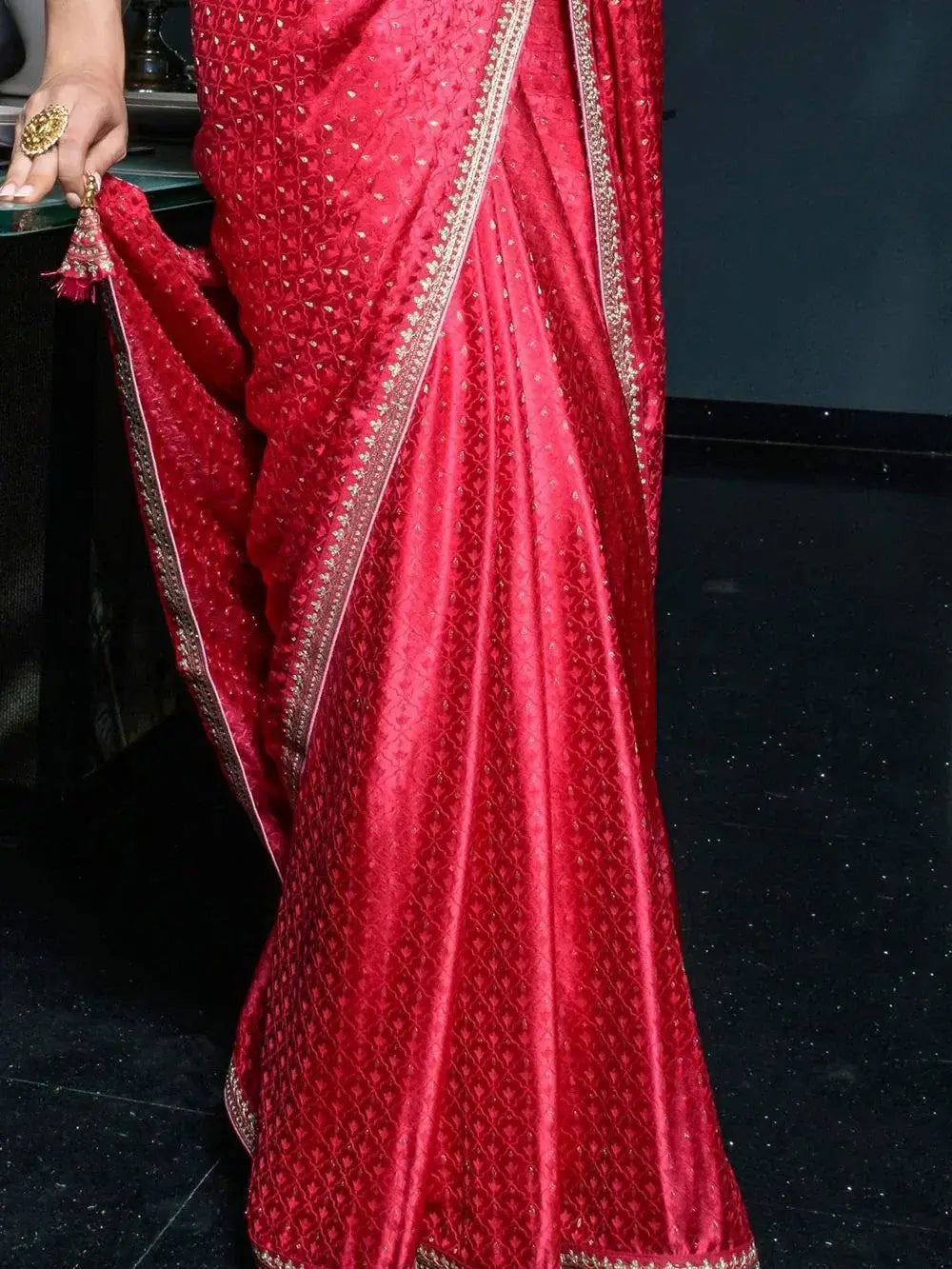 Capture the essence of the season with this coral red satin saree, and let its breezy vibrancy infuse joy and excitement into your special occasions. Whether you're celebrating traditions, love, or simply life itself, this saree will accompany you with grace and style, making your moments even more memorable and cherished.