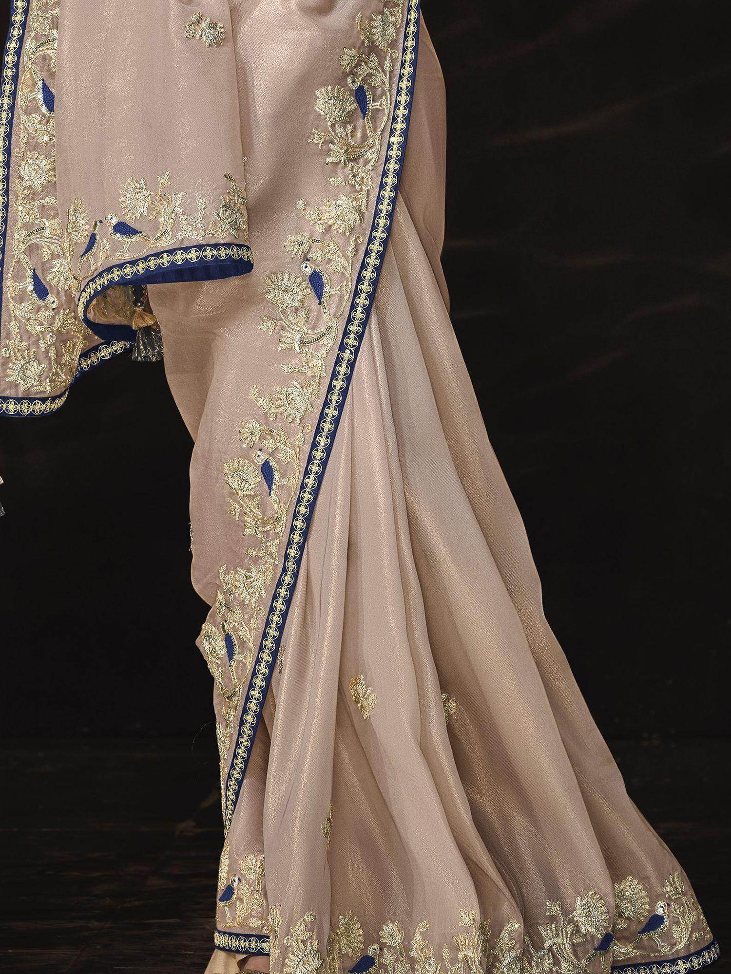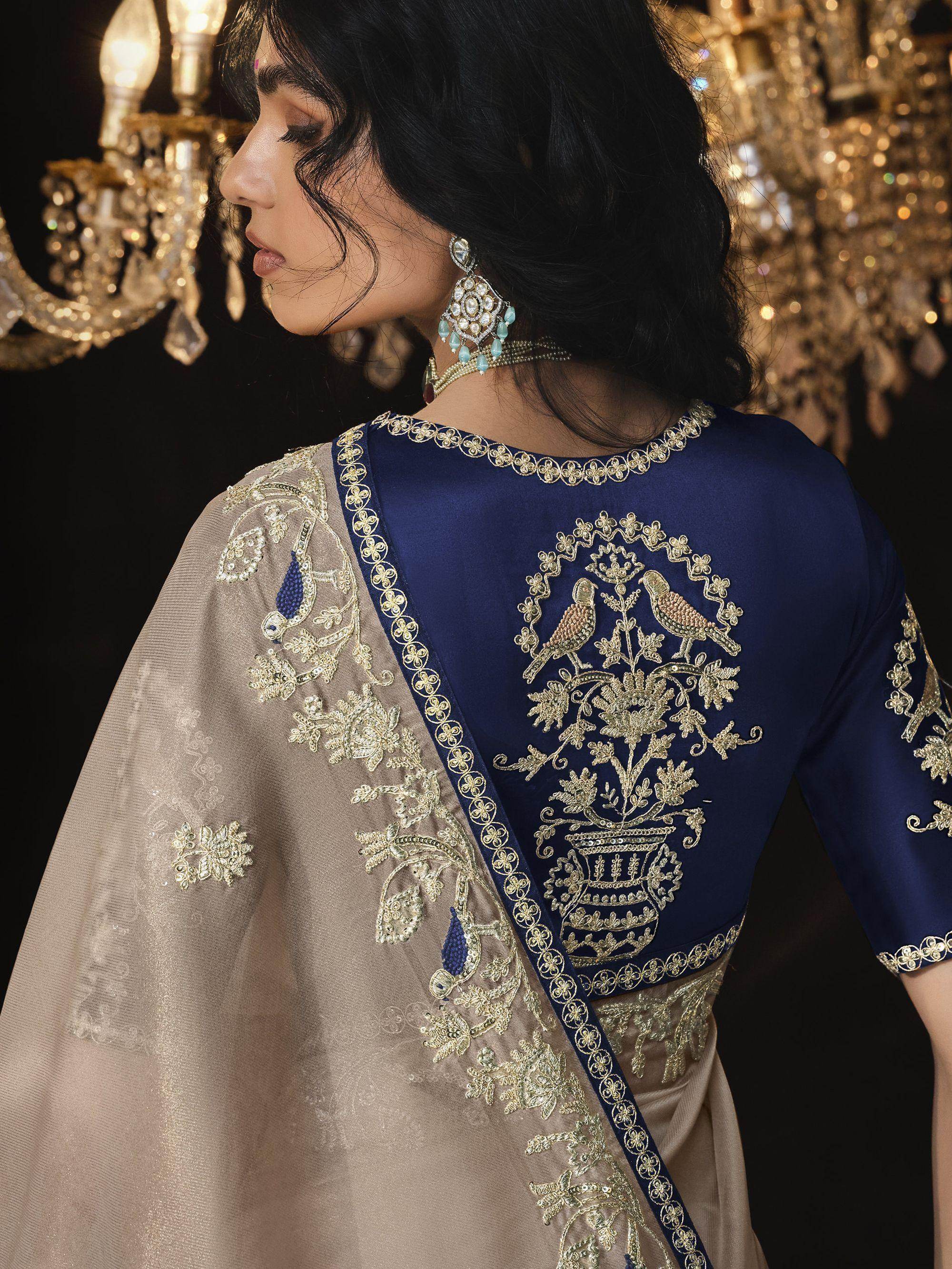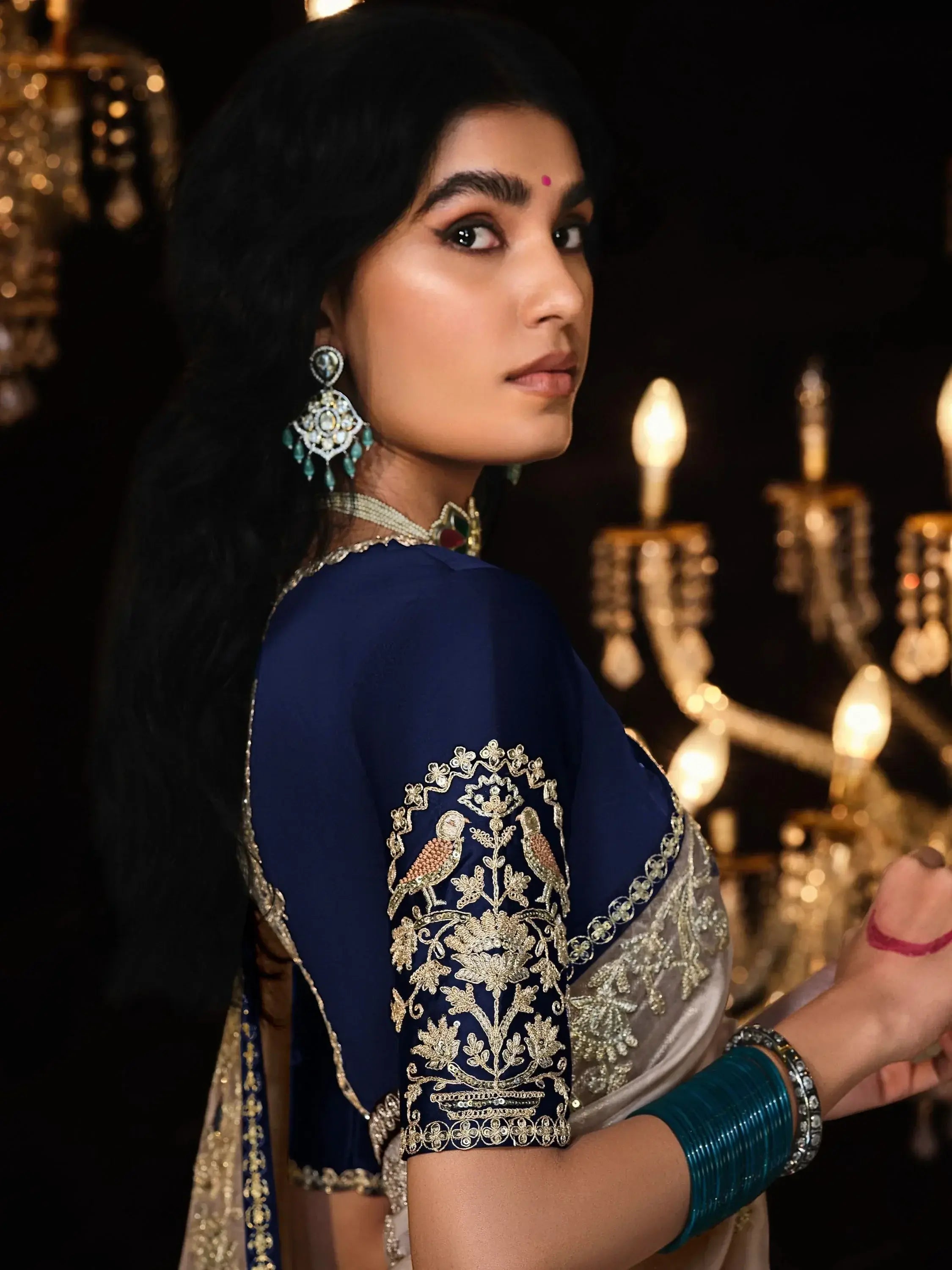 Complementing the creamy hue of the saree is a blouse crafted from luxurious blue silk material, adorned with matching sequin work, stonework, embroidery, and zarkan work. The blouse perfectly harmonizes with the saree, creating a captivating look that is both chic and sophisticated. With its intricate details and impeccable craftsmanship, the blouse adds an extra layer of allure to the ensemble, ensuring that you stand out with effortless grace.