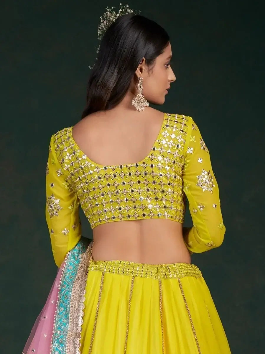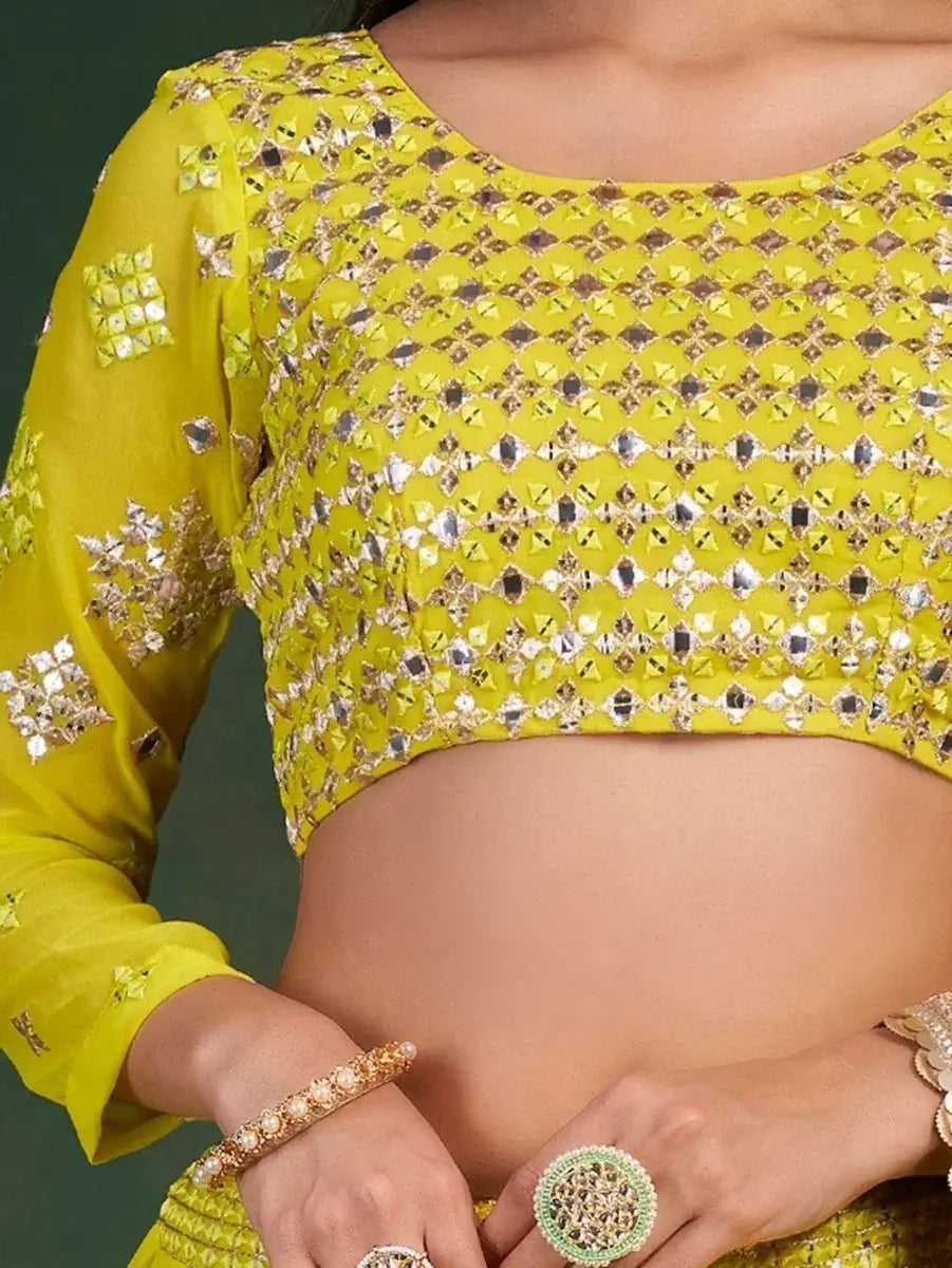 Specially designed this lime yellow lehenga choli is for functions like haldi and sangeet, weddings, and special occasions. Wear this lehenga choli with different accessories and gajra.