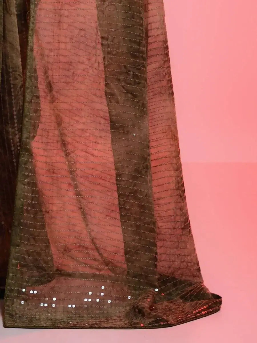 Add more prosperous looks to the persona in this glamorous Mehendi green color chiffon fabric saree decorated with all-over fabulous sequins work. The saree uses a combination of various colors that makes it beautiful.