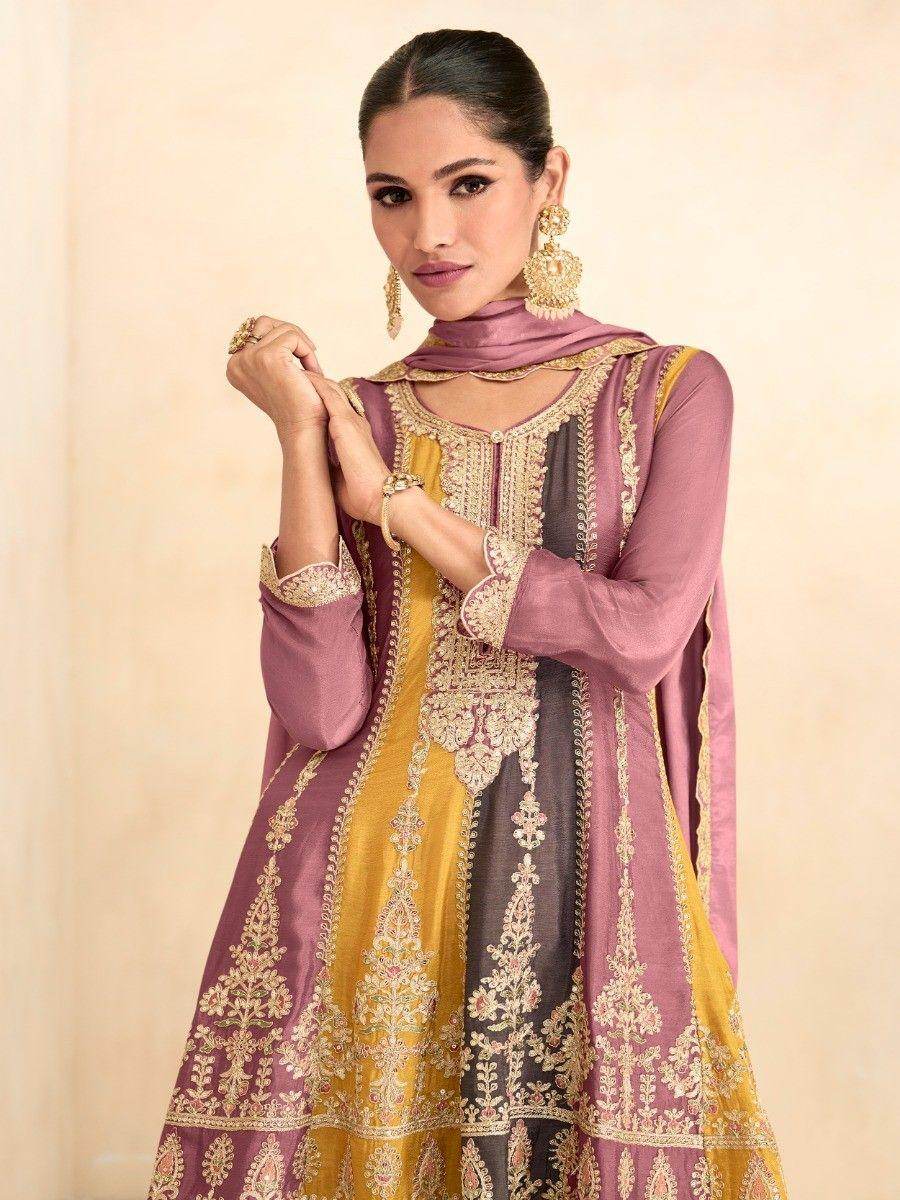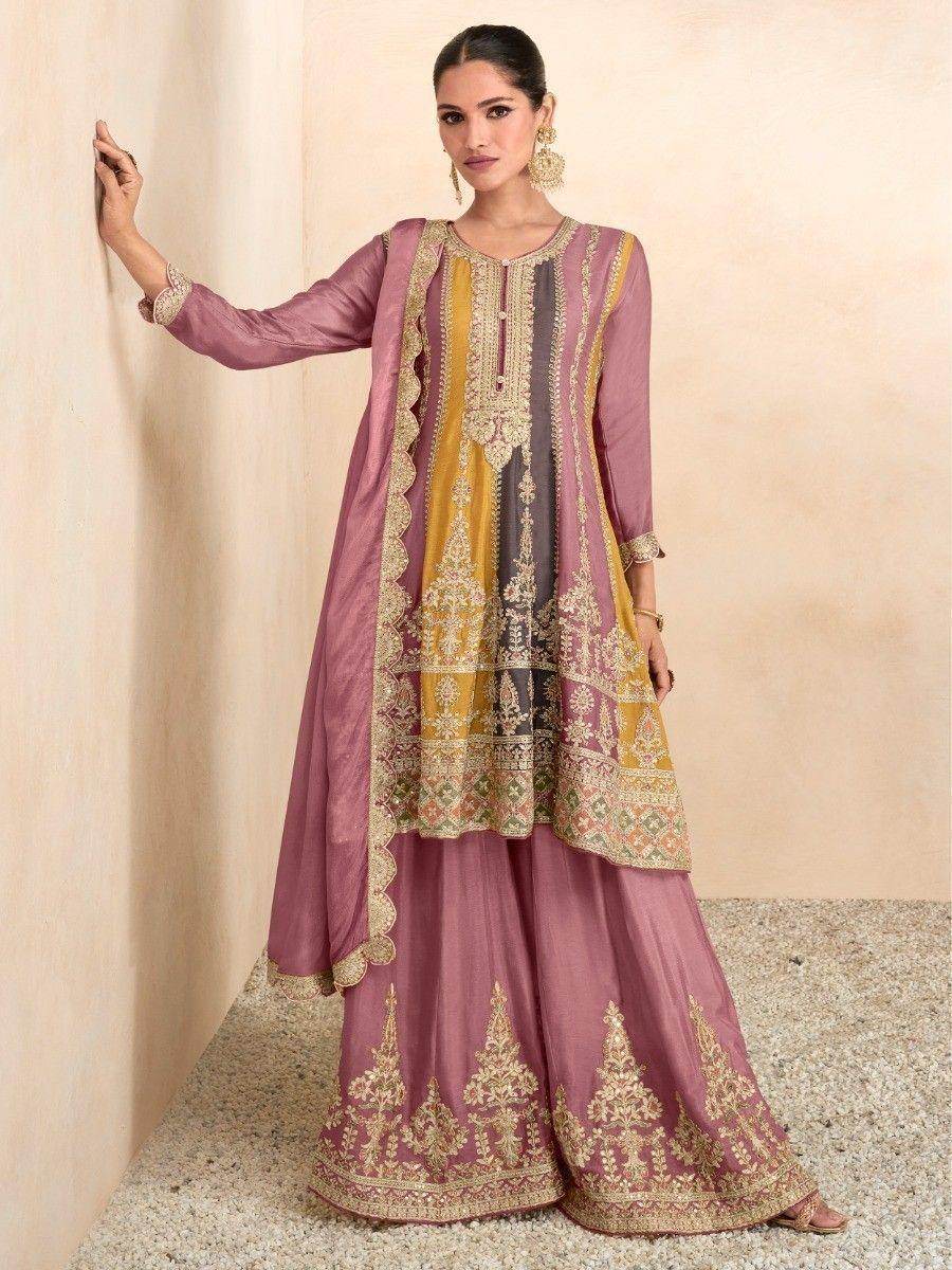 Introducing the glamorous multi-color embroidered chinon festival wear palazzo suit from Ethnic Plus. This stunning ready-to-wear suit is perfect for any special occasion and will make you stand out in the crowd. Made from high-quality chinon material, this suit features intricate thread embroidery and sequin work, adding a touch of elegance and glamour.