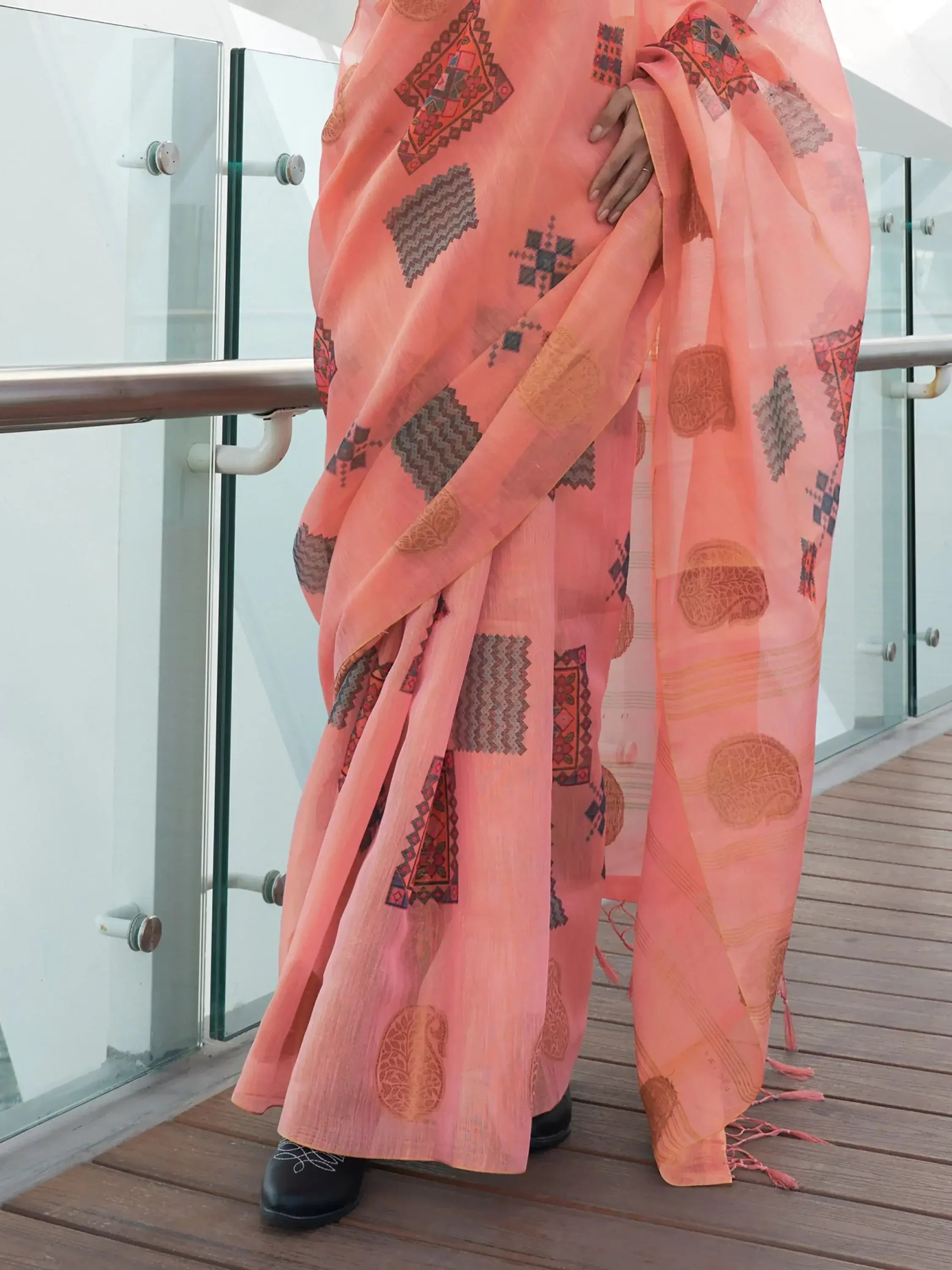 This saree set includes its vibrant peach color, luxurious tissue silk fabric, eye-catching digital print work, and versatile design that can be worn on various occasions.