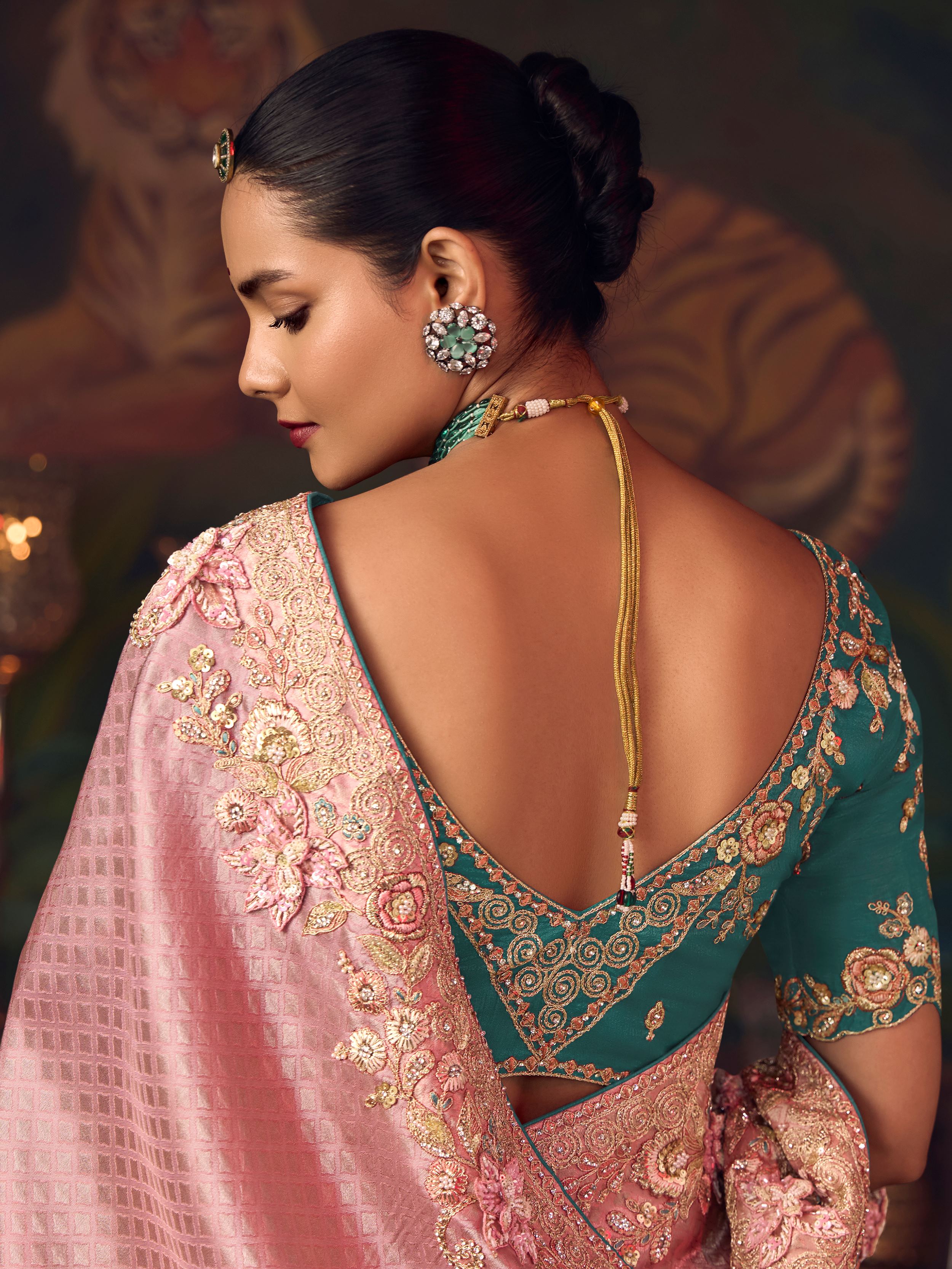 This pink pure silk saree looks soft and elegant, highlighted with beautiful embroidery all over. The detailed floral and sequins work adds a rich and graceful touch to the saree.