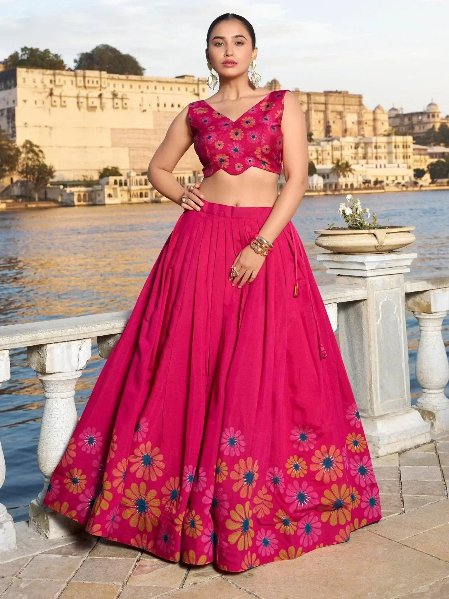 This lehenga choli set include its vibrant pink color, elegant floral print work, and shimmering foil detailing. The matching dupatta adds a touch of sophistication with its floral print work and foil work, complemented by attractive lace touch-up. This ensemble is perfect for sangeet wear, festivals, and other special occasions where you want to make a style statement.