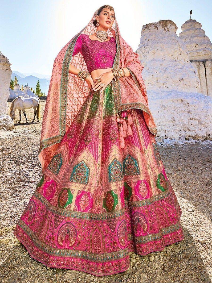 Made from high-quality pink viscose silk material, the lehenga features exquisite details such as fancy dori work, stone work, zari weaving work, and multi-thread work. These embellishments add a touch of glamour and sophistication to the overall design, making it a truly eye-catching piece.