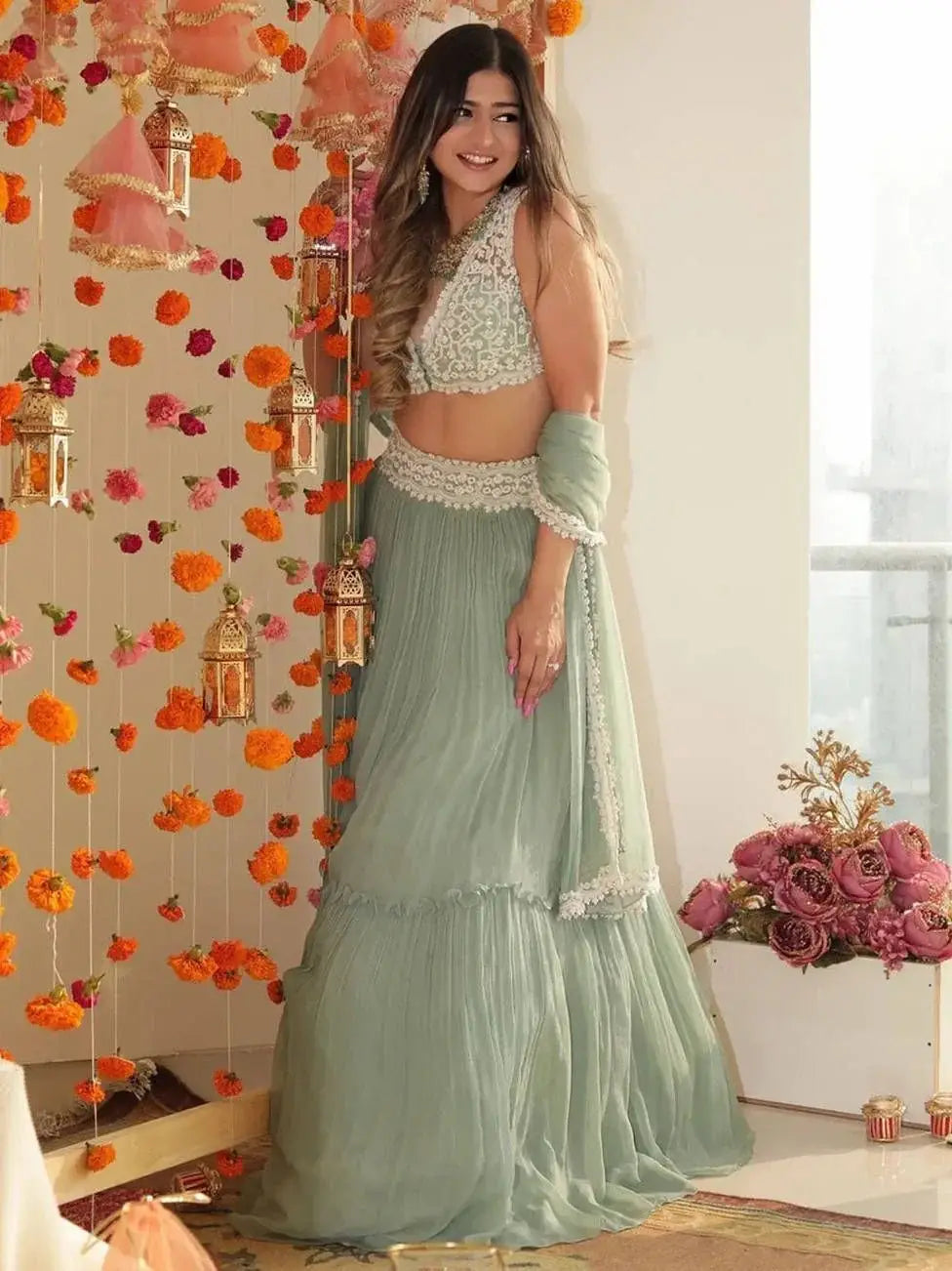 Make a swish appearance each time these glamorous pista green color georgette material lehenga embellished with cotton thread work with sequins work lehenga attached with can-can and canvas inside.