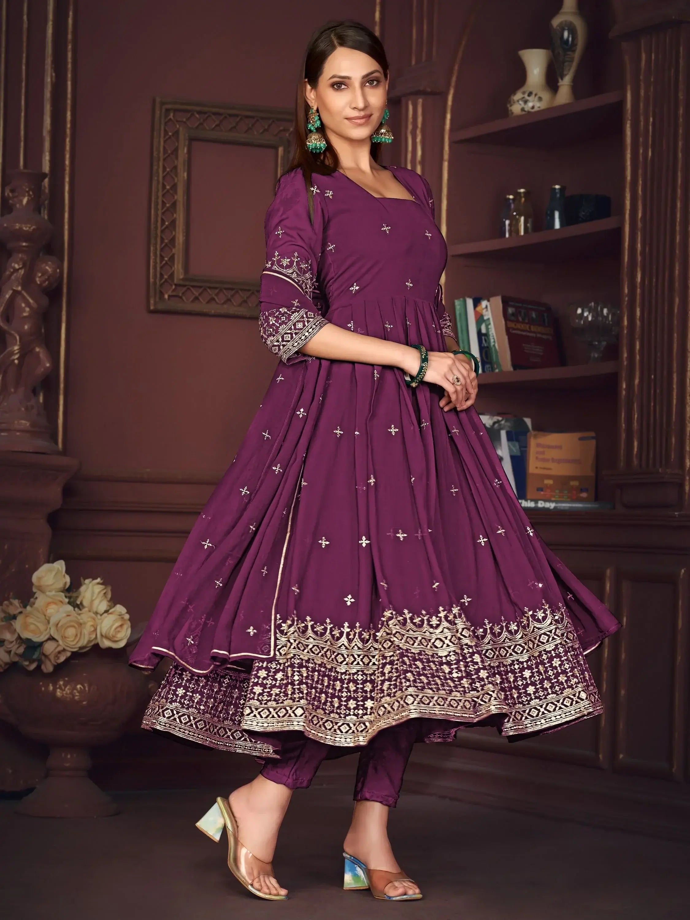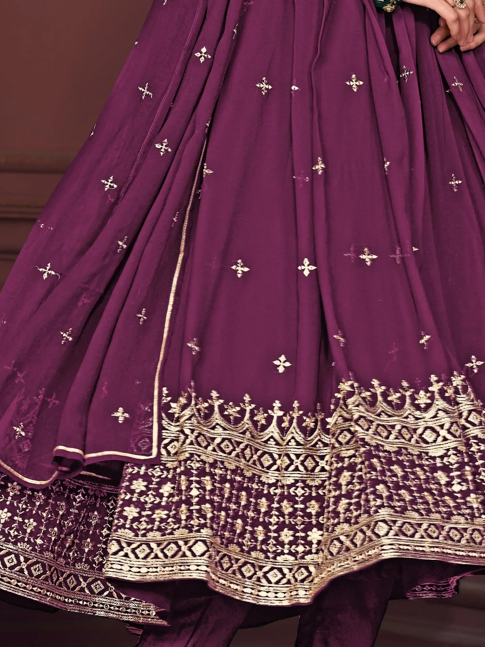 This "glamorous purple embroidered georgette function wear anarkali suit" is not just a piece of clothing, but a statement of style and grace. Made for those who appreciate fine craftsmanship and intricate detailing, this outfit is a must-have for your ethnic wear collection. Whether you're attending a wedding, a festive celebration, or a special event, this suit will help you make a lasting impression.