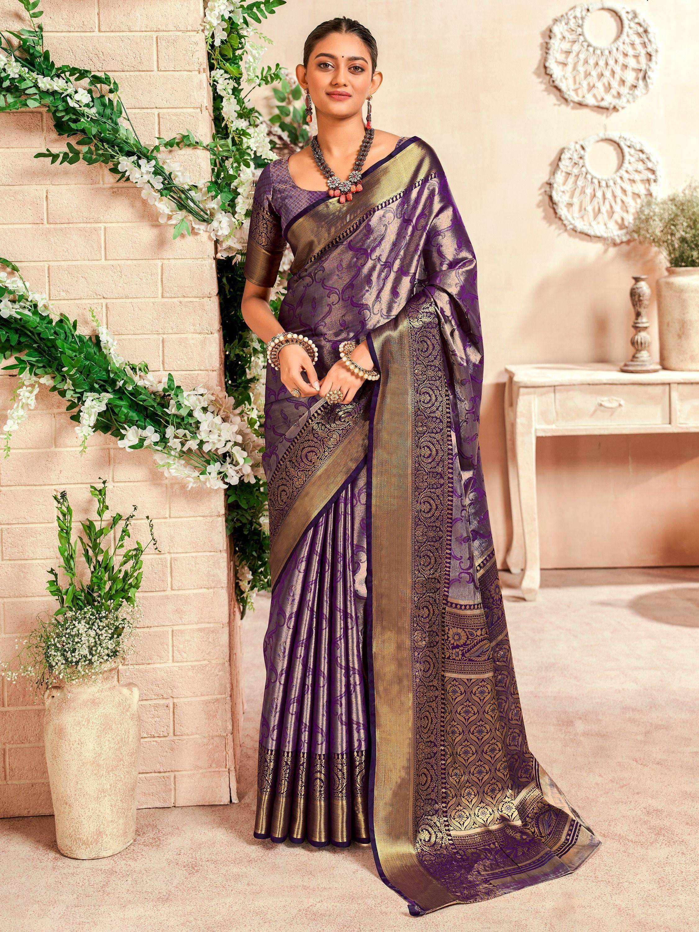 Celebrate your upcoming festivals, weddings, and functions with this beautifully designed purple saree, which promises to give you a proper ethnic look. The regal purple hue symbolizes luxury, creativity, and spirituality, making it a perfect choice for significant life events. The traditional zari weaving work reflects a rich cultural heritage, adding an element of sophistication to your ensemble. Whether you are a bride, bridesmaid, or a guest, this saree is sure to make you stand out in the crowd.