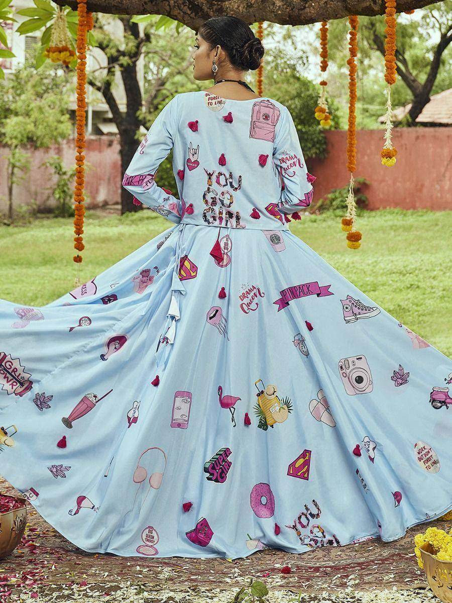 Create your special look more effectively by enrobing this glamorous sky blue color fully flare maslin cotton material lehenga embellished with digitally printed with all-over lovely tassels and pasting work.