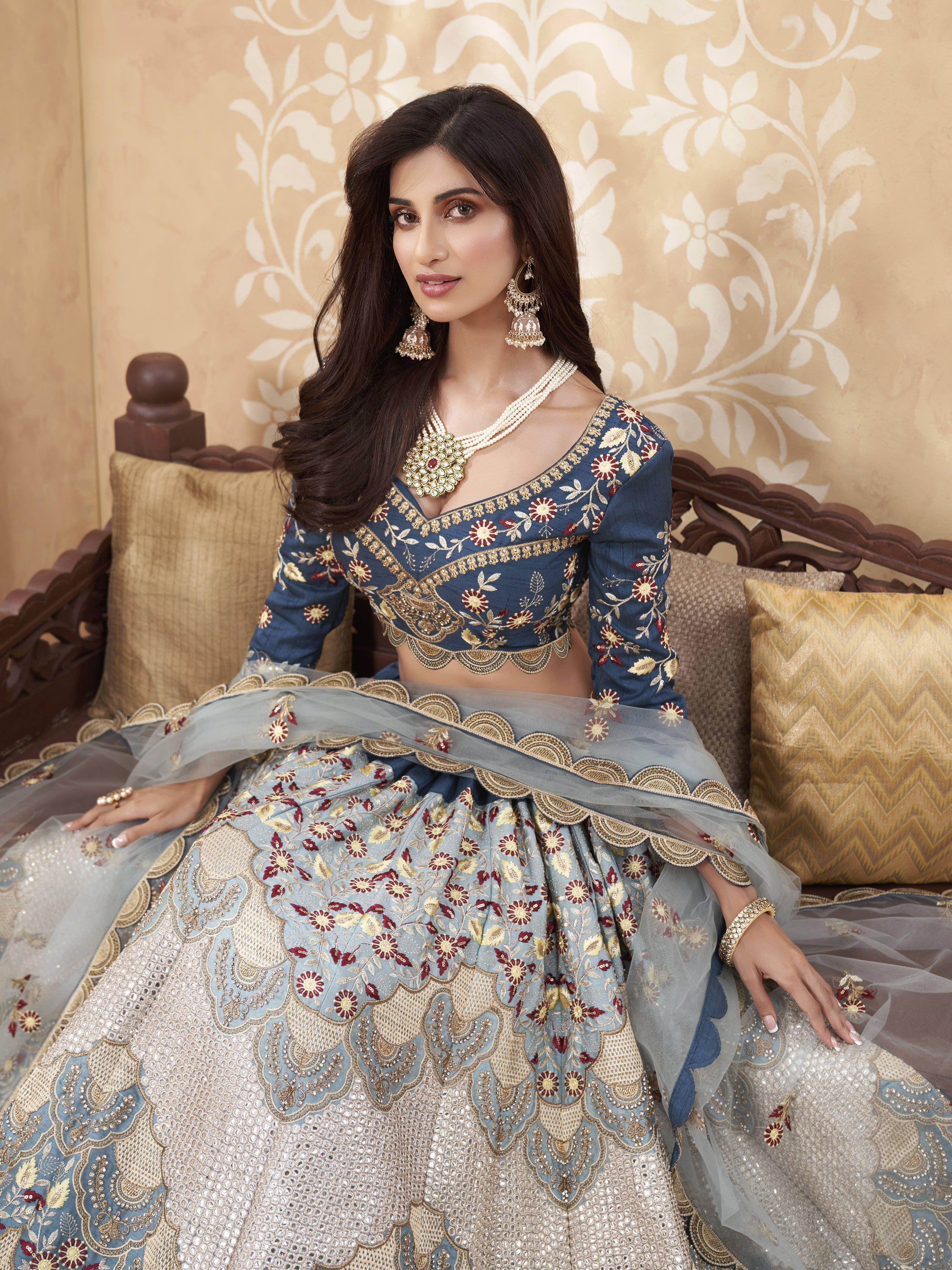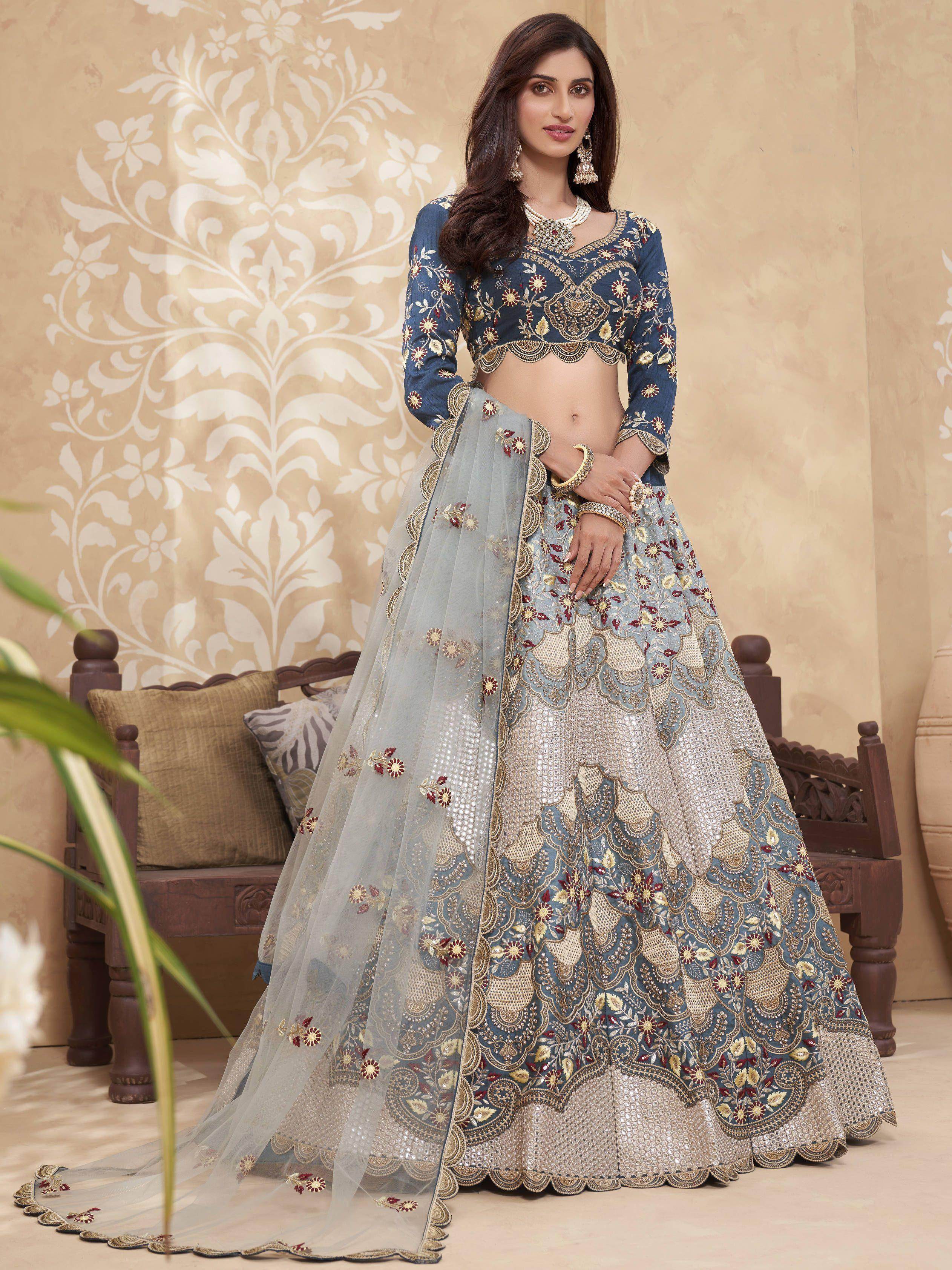 Present an energetic highlight to your ethnic attire by donning this lovely sky blue color lehenga choli in heavy silk material embellished with heavy zarkan, thread embroidery with mette work.
