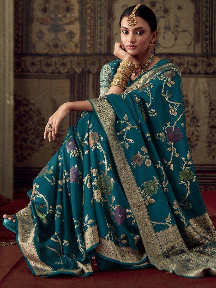 Introducing our glamorous teal blue zari woven georgette festival wear saree, a stunning piece that will surely make you the center of attention at any event. This saree is made from high-quality georgette material in a beautiful teal blue color, giving it an elegant and luxurious look. The zari weaving work all over the saree adds a touch of opulence, making it perfect for festivals, receptions, engagements, or weddings.