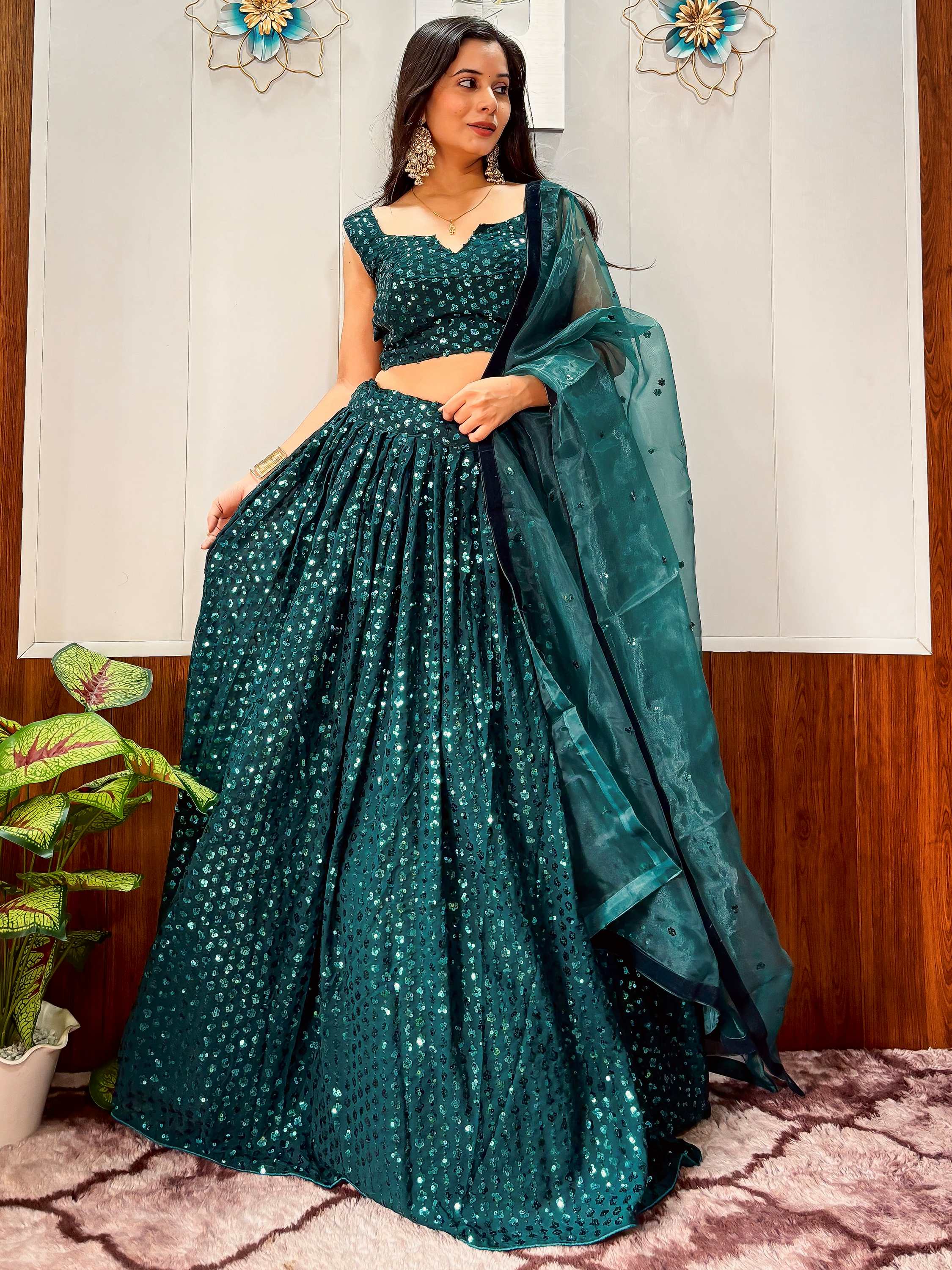 This stunning ensemble features a deep green sequined lehenga choli that radiates elegance and festive allure. The fabric shimmers beautifully under the light, making it a show-stopping choice for weddings, sangeet, and parties.