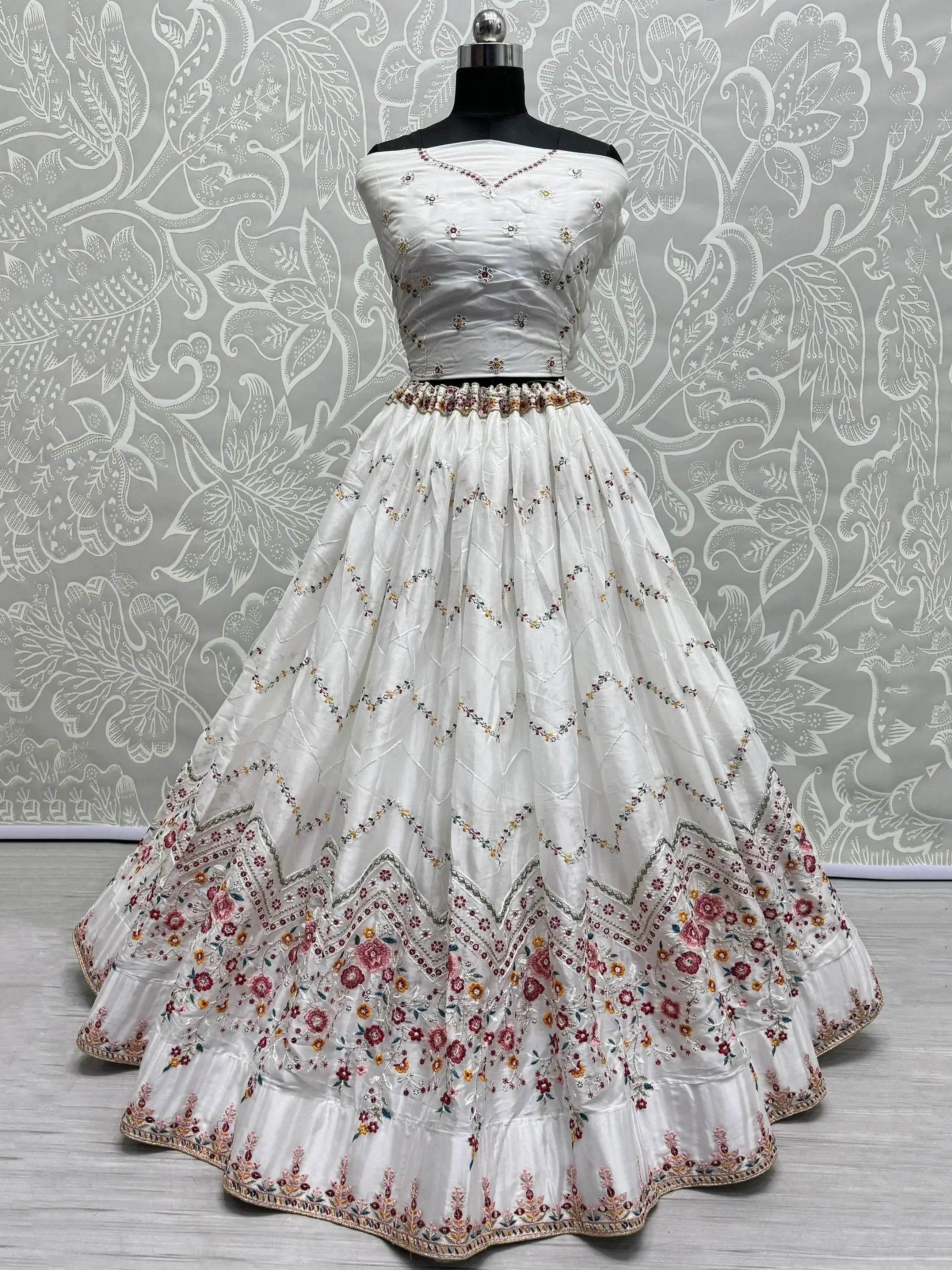 Our glamorous white thread-work silk function-wear lehenga choli is the perfect choice for those looking to make a statement at any special event. With its stunning design and high-quality materials, this ensemble is sure to turn heads and make you feel like a true fashionista.