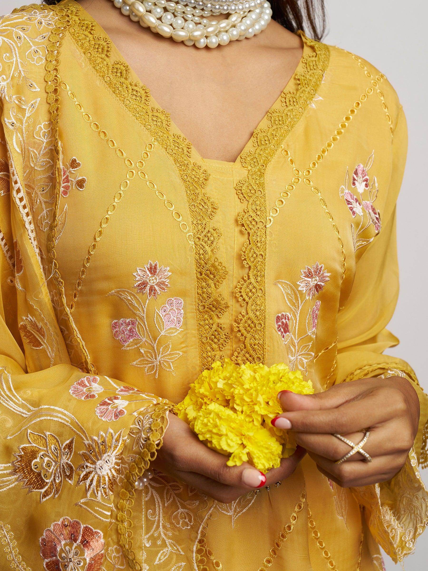 This outfit includes exquisite thread embroidery, sequin work, and lace detailing which add a touch of elegance and sophistication to the ensemble. The vibrant yellow color is perfect for special occasions like Eid and will surely make you stand out in the crowd. The high-quality fabric and craftsmanship ensure a comfortable fit and a luxurious look.