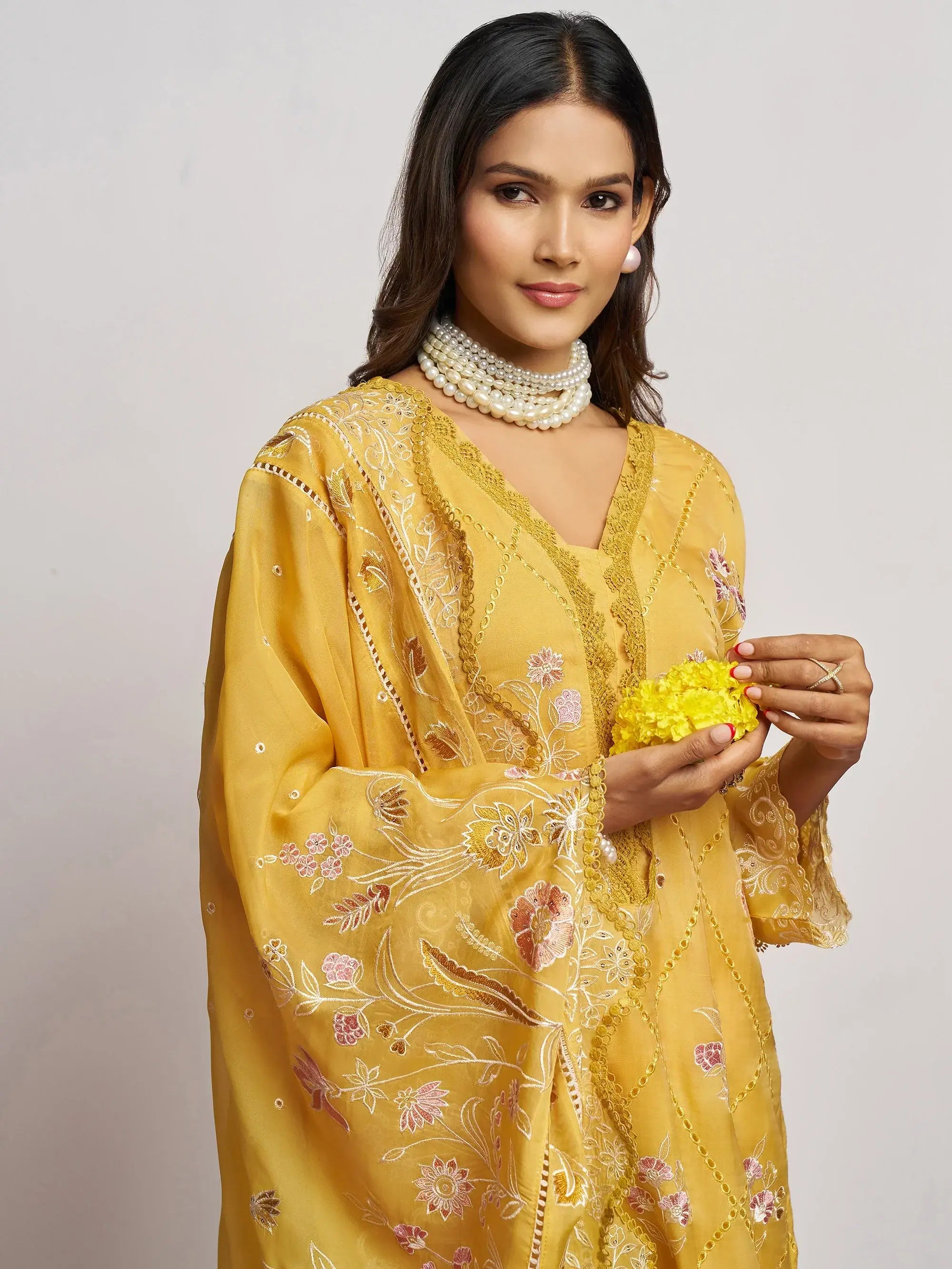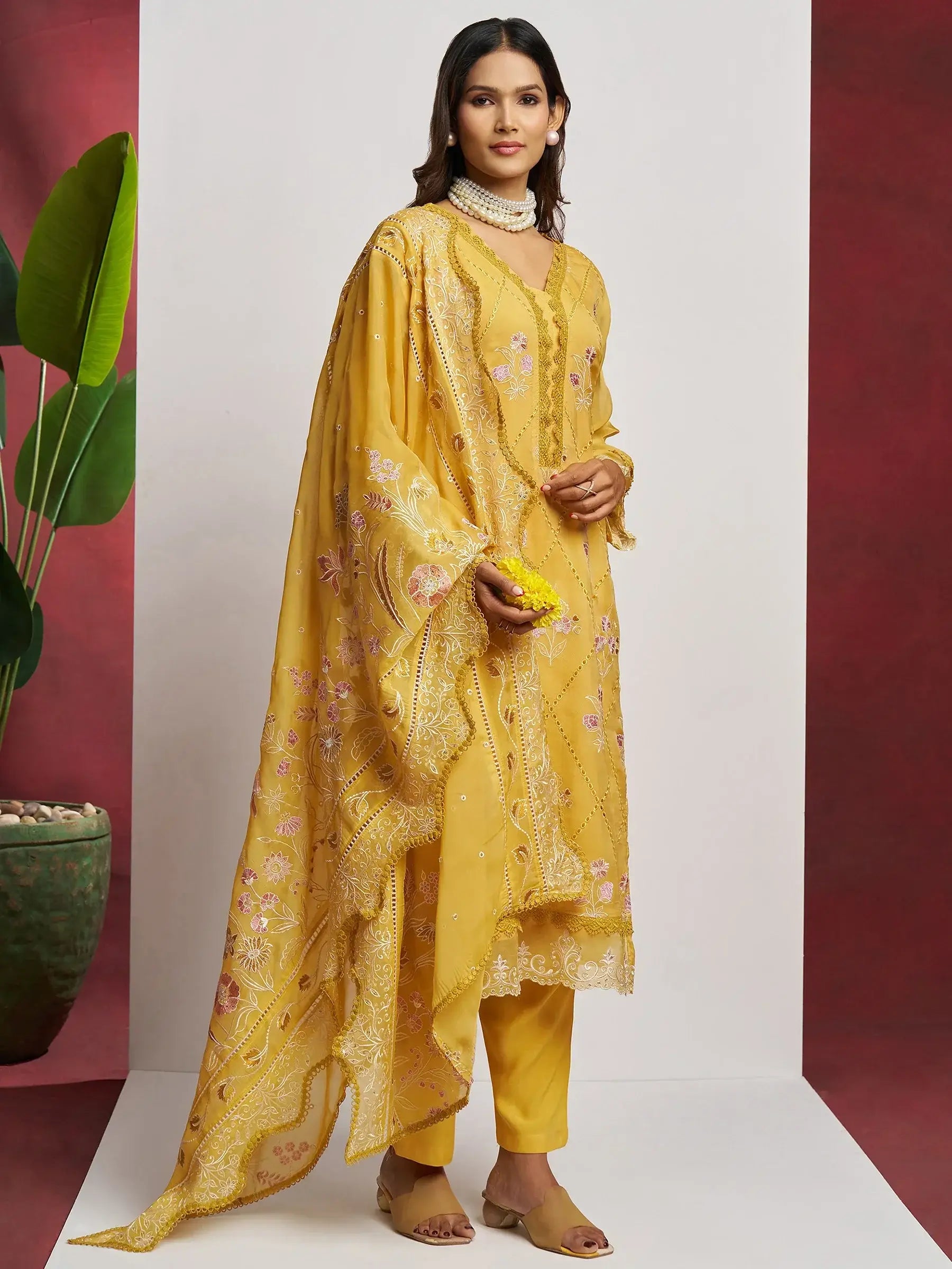 This stunning outfit features a yellow color organza suit adorned with intricate thread embroidery, sequin work, and lace work. The suit comes with a similar color organza dupatta with thread embroidery and sequin work, along with a matching rayon pant. The suit is un-stitched up to 42 inches, giving you the freedom to customize it to your perfect fit.
