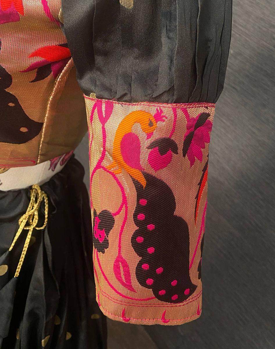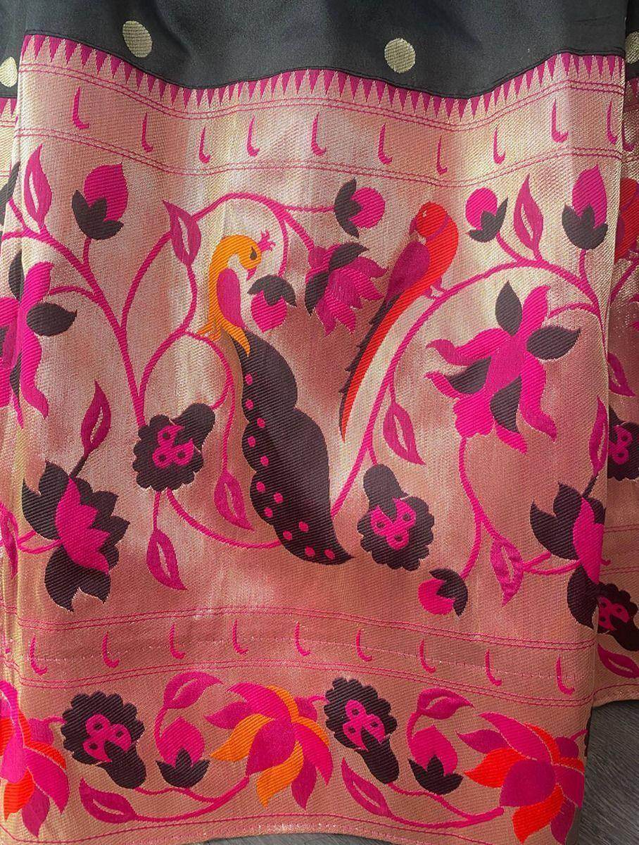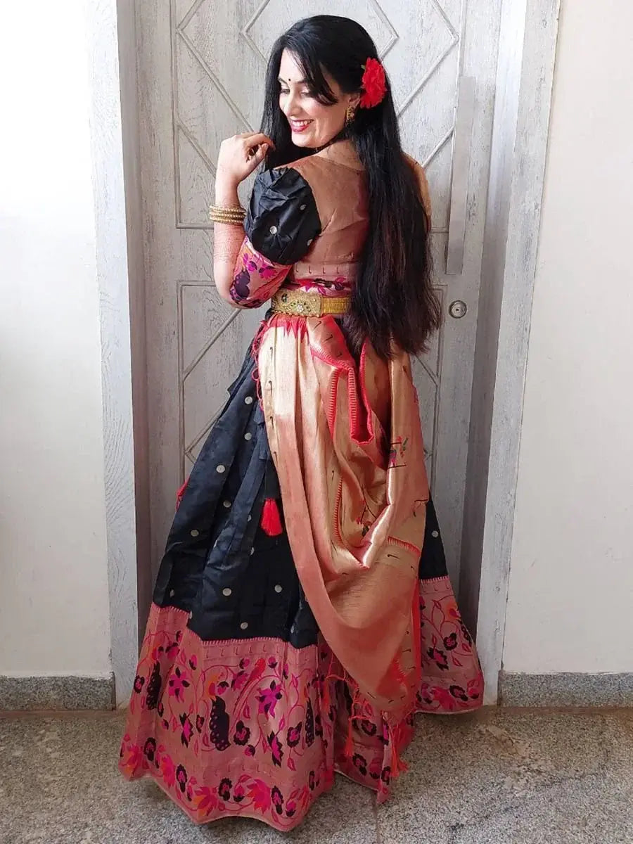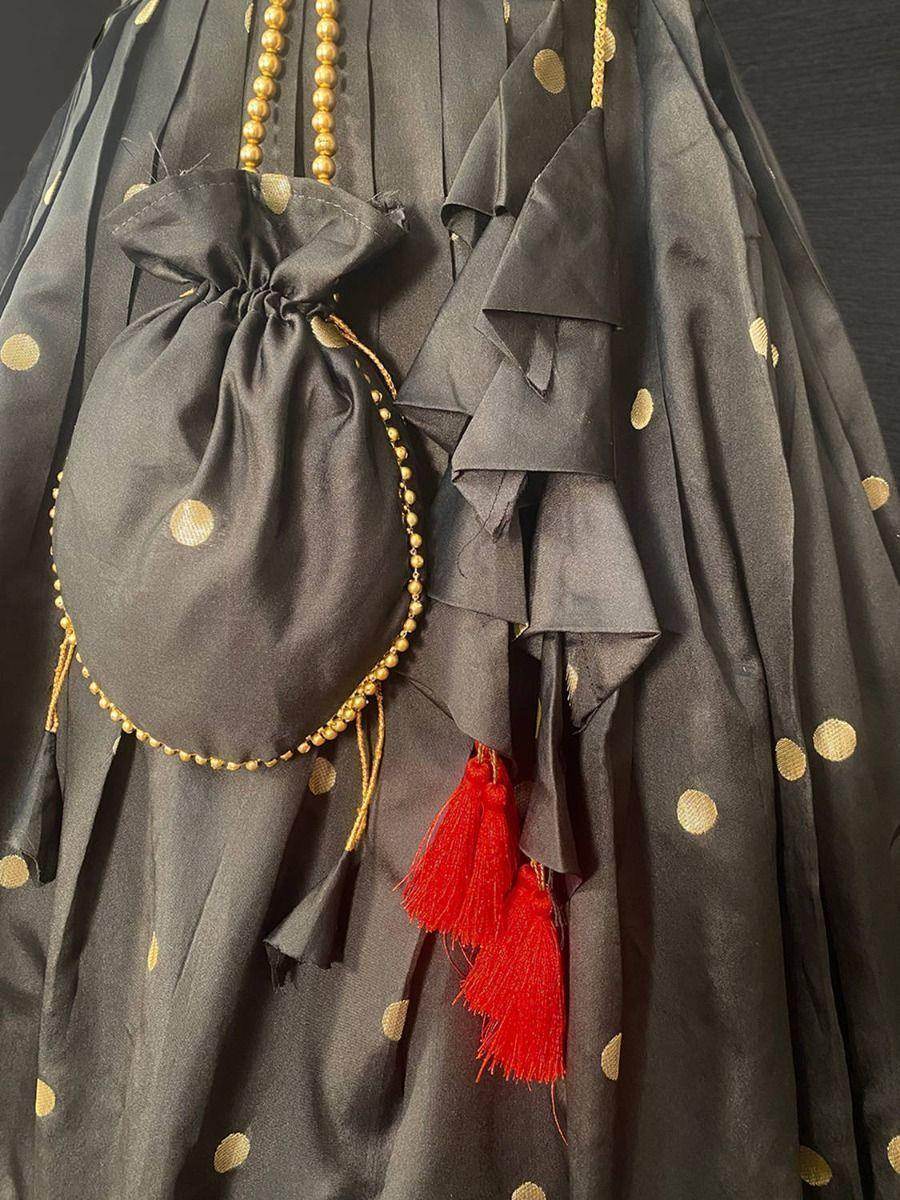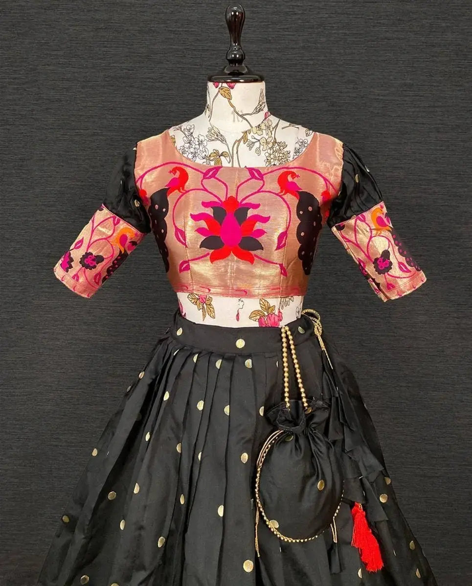 Get traditional touch to your look by adorning this black color south Indian flare half saree lehenga in jacquard(Paithani) material beautified with all-over zari weaving work comes with handmade tassels and micro cotton inner fabric attached with canvas inside and comes with Batva style purse in jacquard work with pearl lace border.