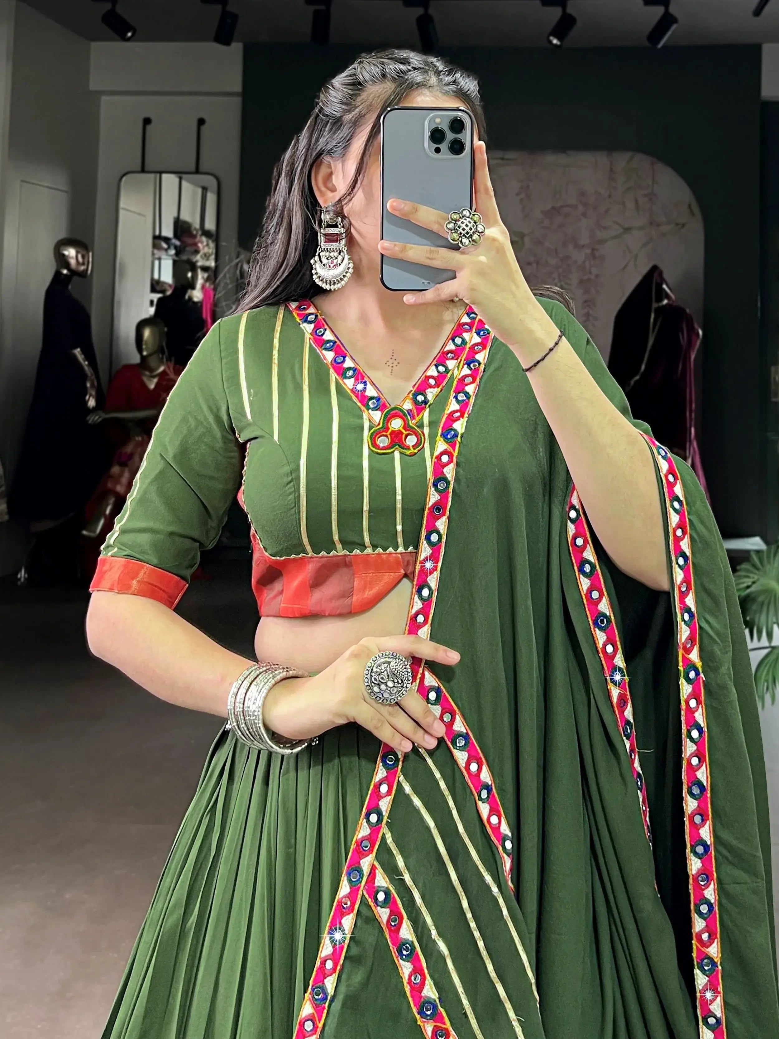 This elegant green lehenga in pure rayon fabric is crafted with original mirror Gamthi work and detailed with Gotta Patti lace touch-up. The 8-meter flair adds volume and charm, making it perfect for festive and traditional occasions.