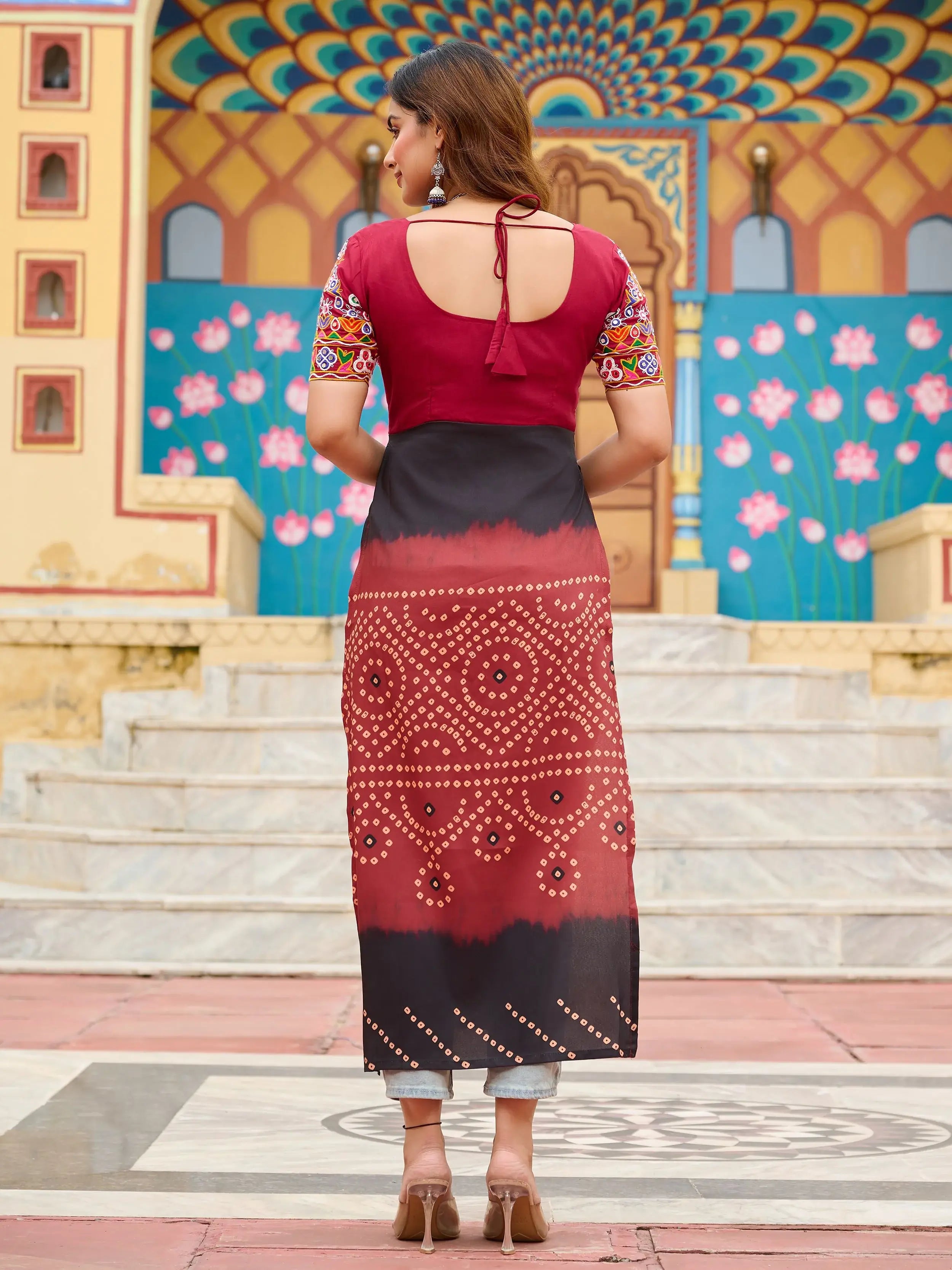 The short sleeves showcase intricate Kutchi-style embroidery, perfectly complementing the kurti’s bold bandhani-inspired motifs. Every element speaks of traditional aesthetics reimagined for modern wear.