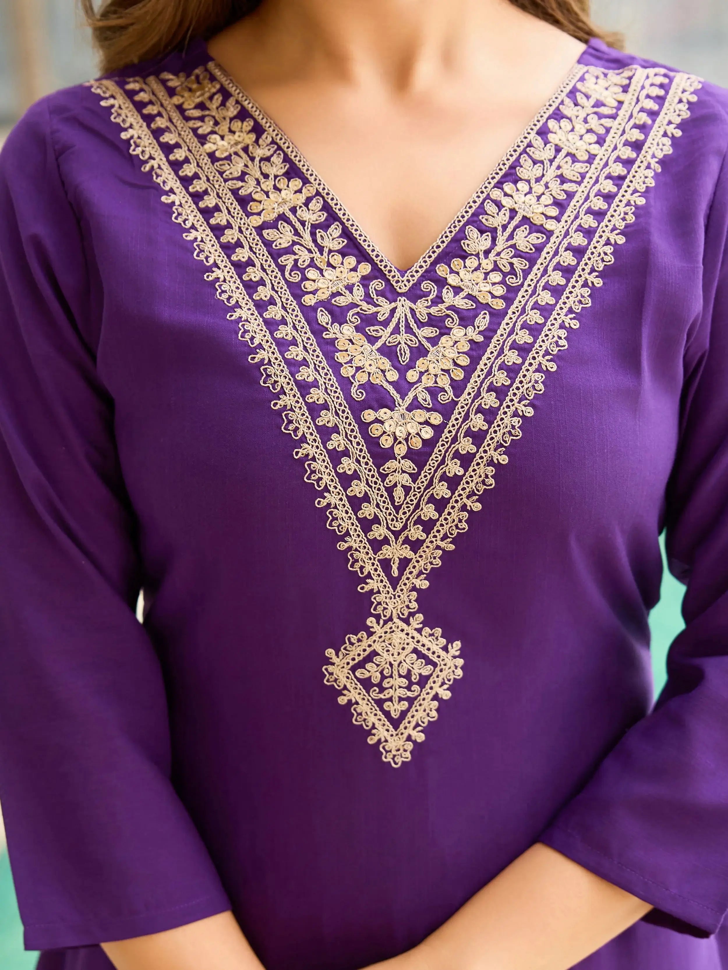 This stunning purple rayon suit exudes elegance with its intricate embroidery on the neckline, creating a graceful and refined look. The rich shade of purple enhances its charm, making it perfect for festive and formal occasions.