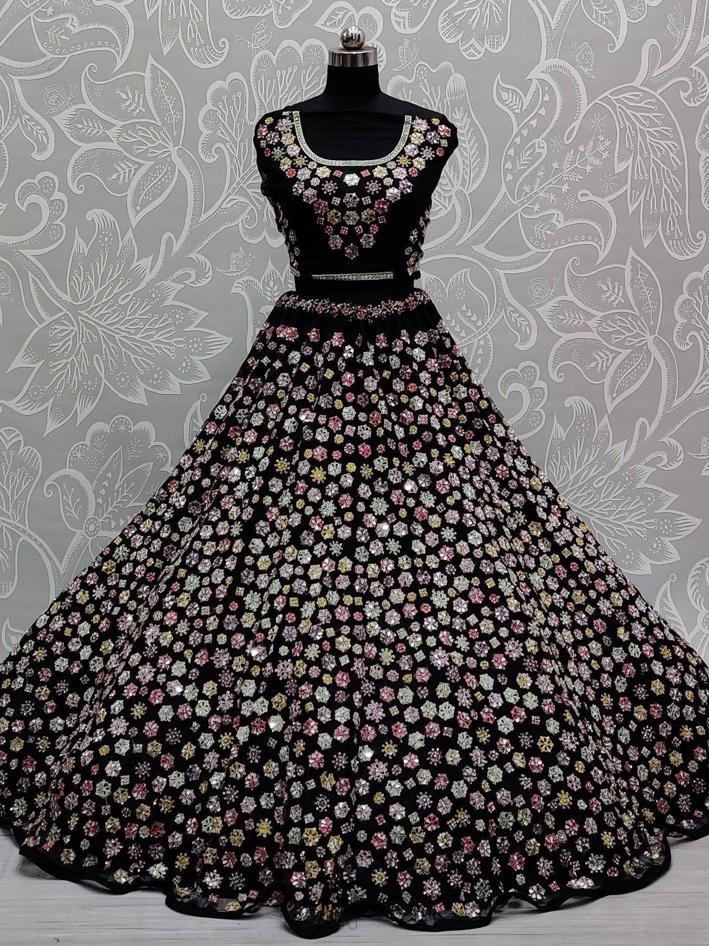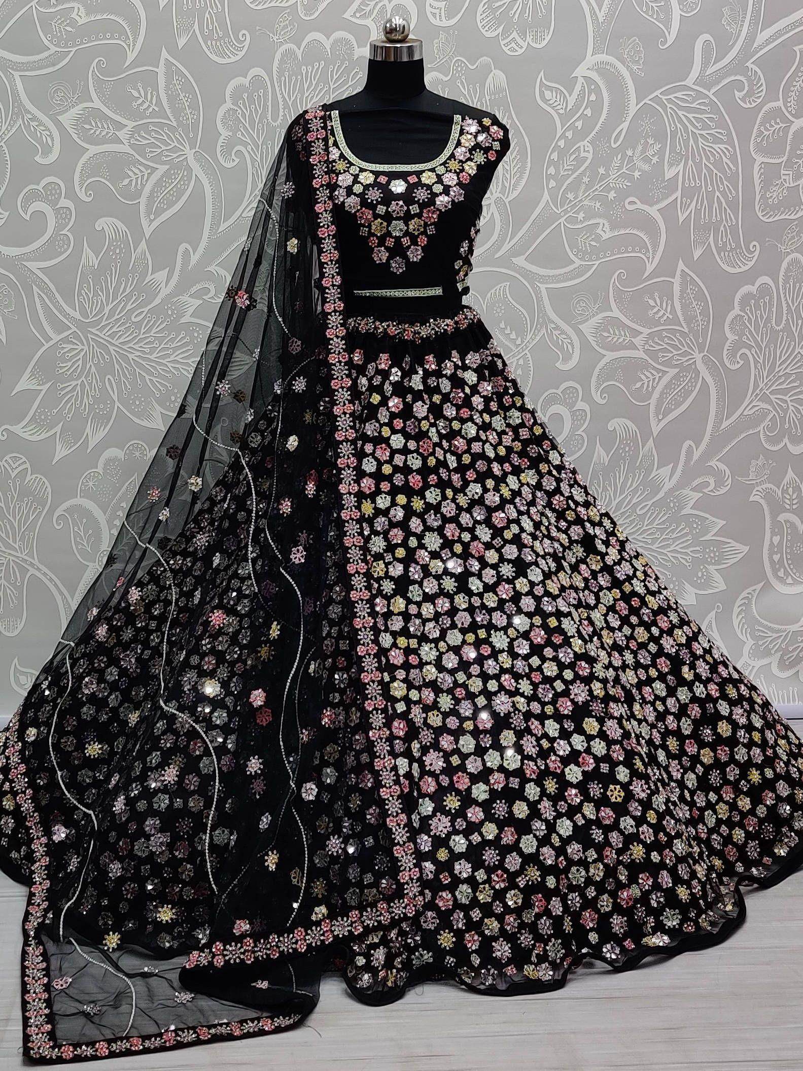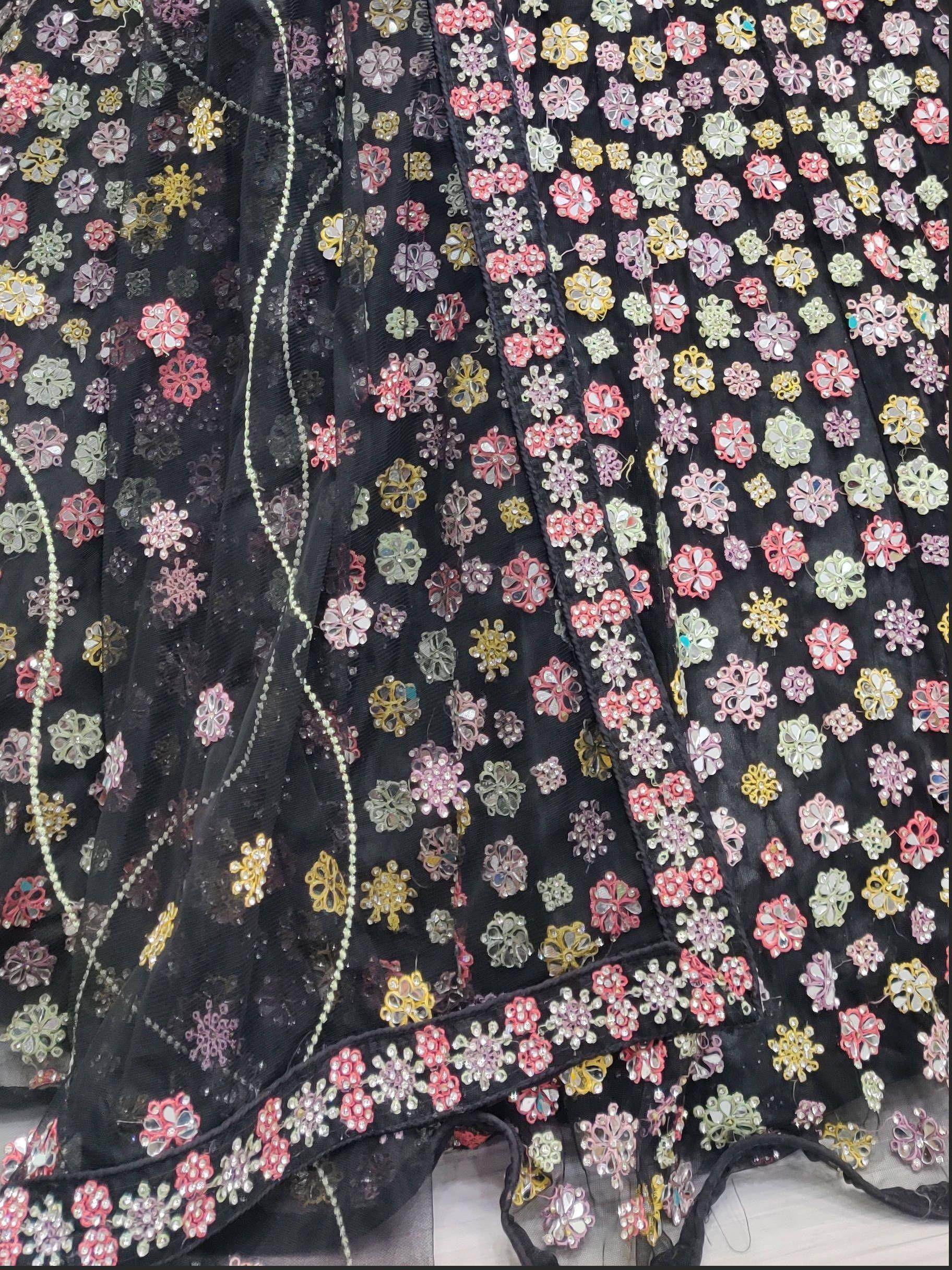 Spread the aura of freshness with this prominent black color lehenga made of net material embellished by mirror work, multi-color thread work, handwork, diamond work.