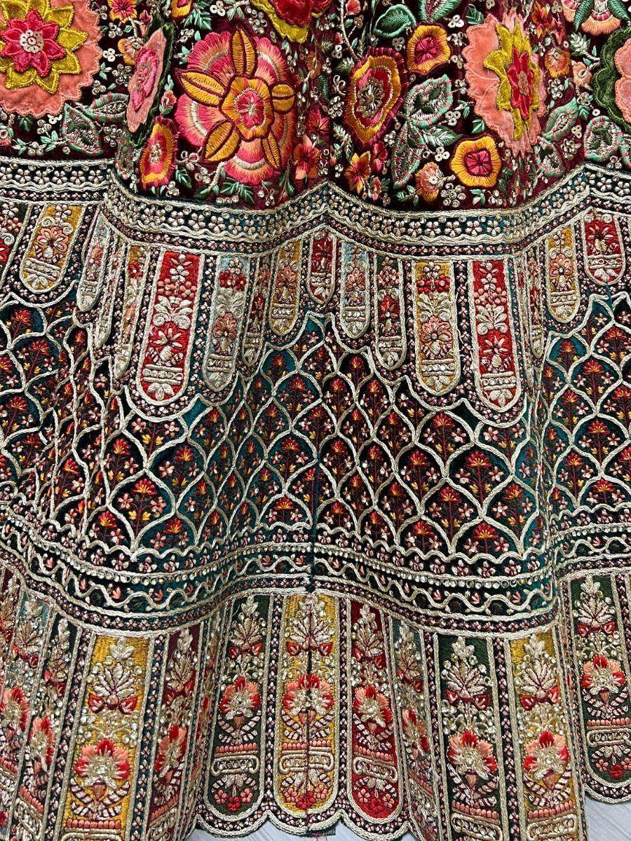 This lehenga is its heavy multi-thread and dori embroidery, adorned with precious diamonds and heavy sequin work. The beautiful work details include booty work, border work, floral embroidery, multi work, patchwork, sequins work, stone work, and thread embroidery, making this piece truly unique and breathtaking.