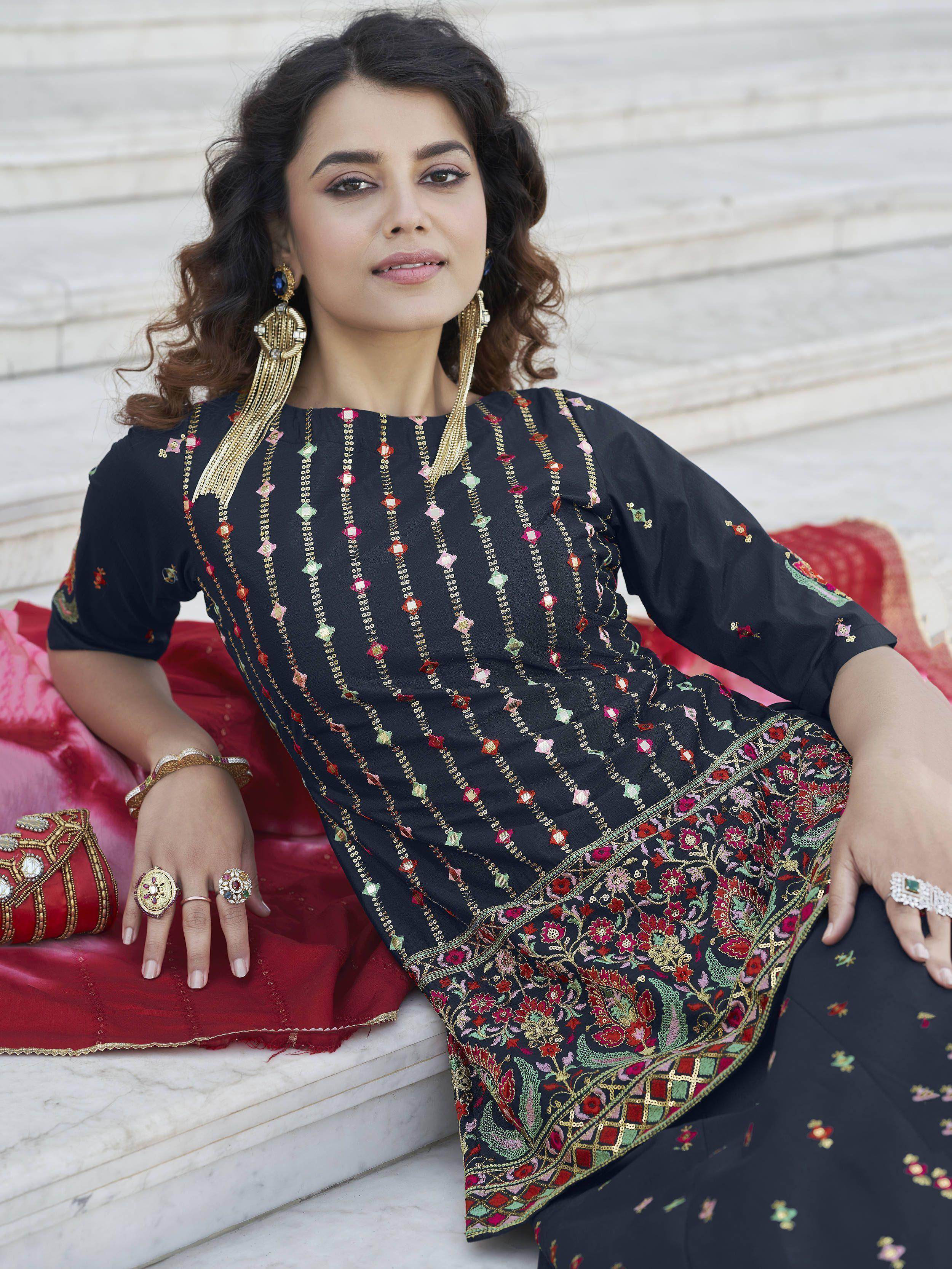 Raise the curtains on the stage of life, draped in the magical beauty of this glorious navy blue color chinon chiffon material embellished with gotta Patti and multi-thread with sequins embroidery with floral work.