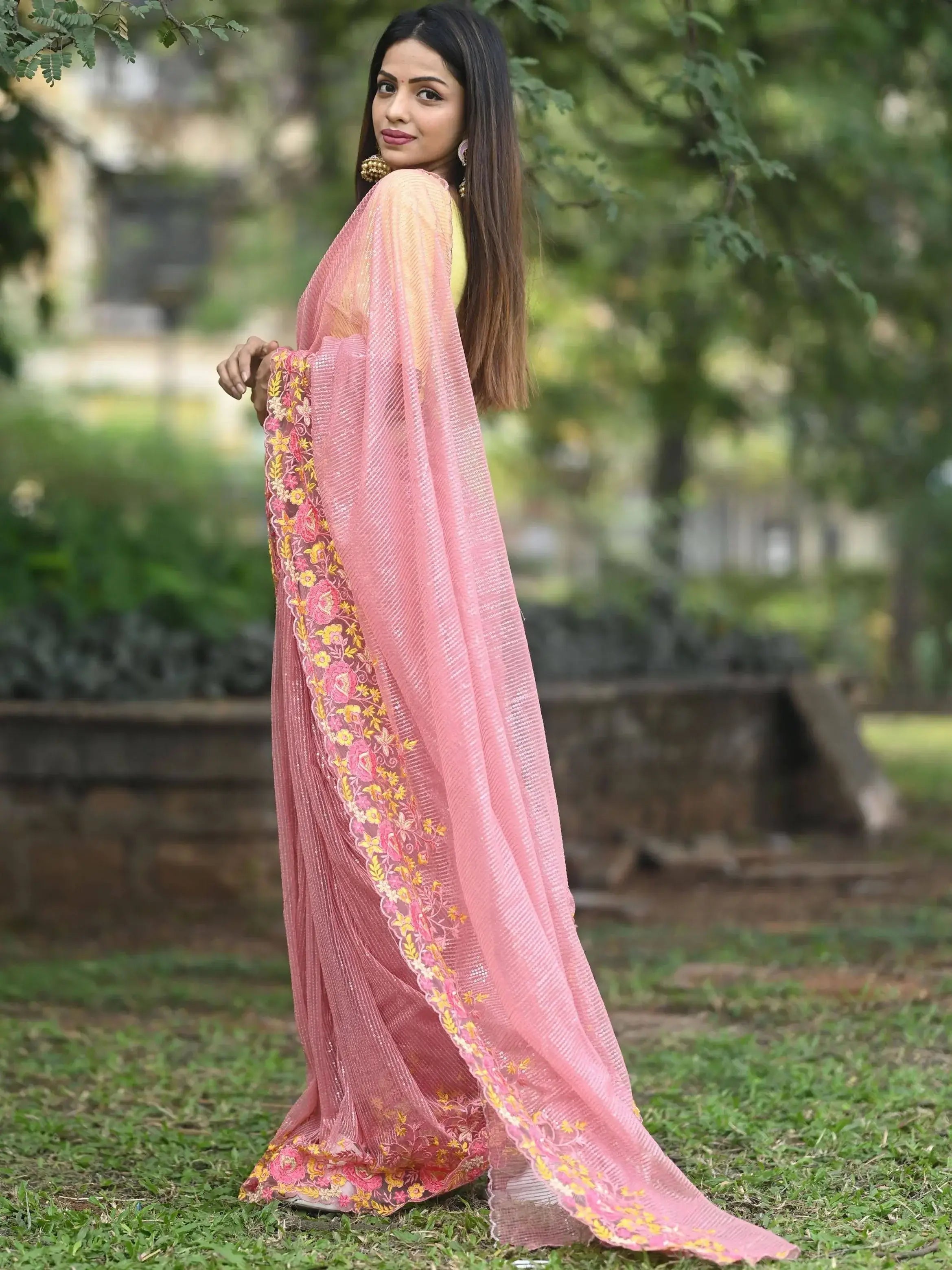 Bring back the traditional charm to your closet with this exceptional pink color saree made of soft net material with satin inner embellished with sequins and thread embroidery work.