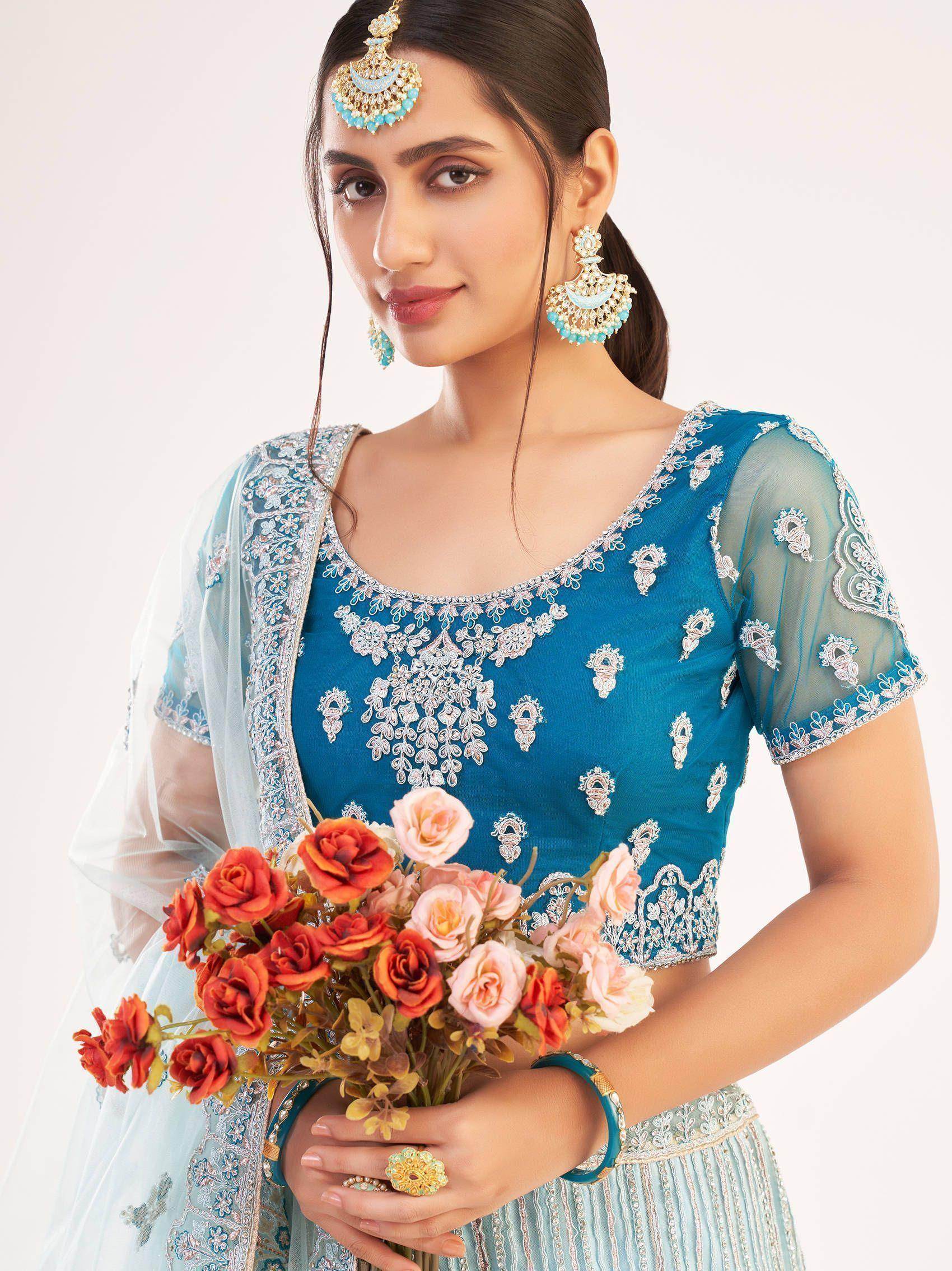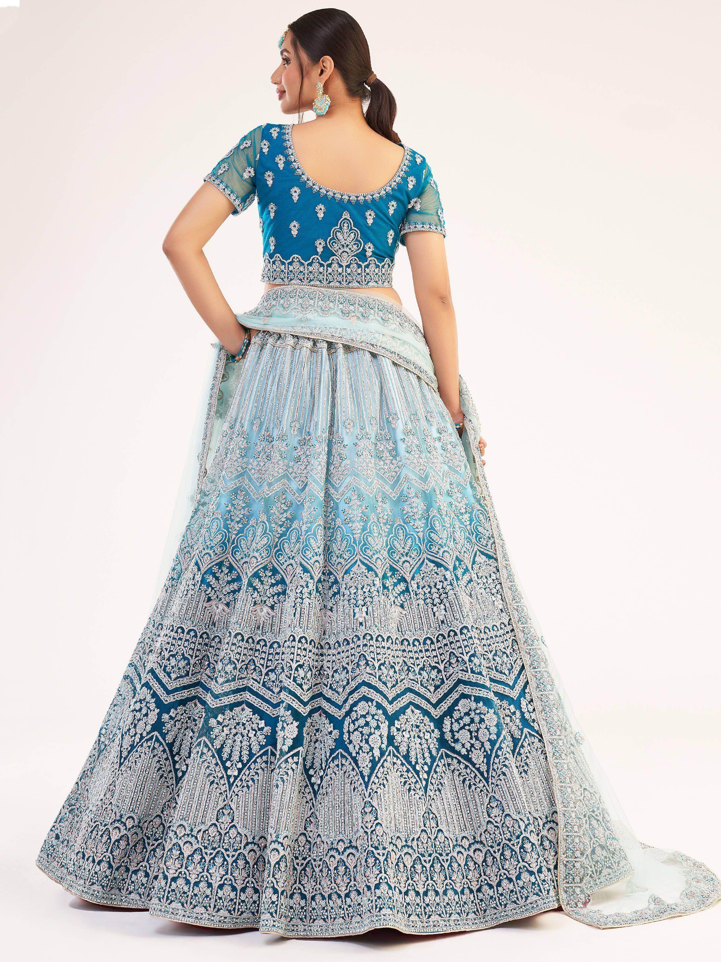 Spread the aura of freshness with this prominent teal blue color lehenga made of heavy shaded butterfly net material embellished with all-over cording, thread, sequins embroidery, and heavy zarkan handwork featured with sequins belt comes with attached can-can inside.
