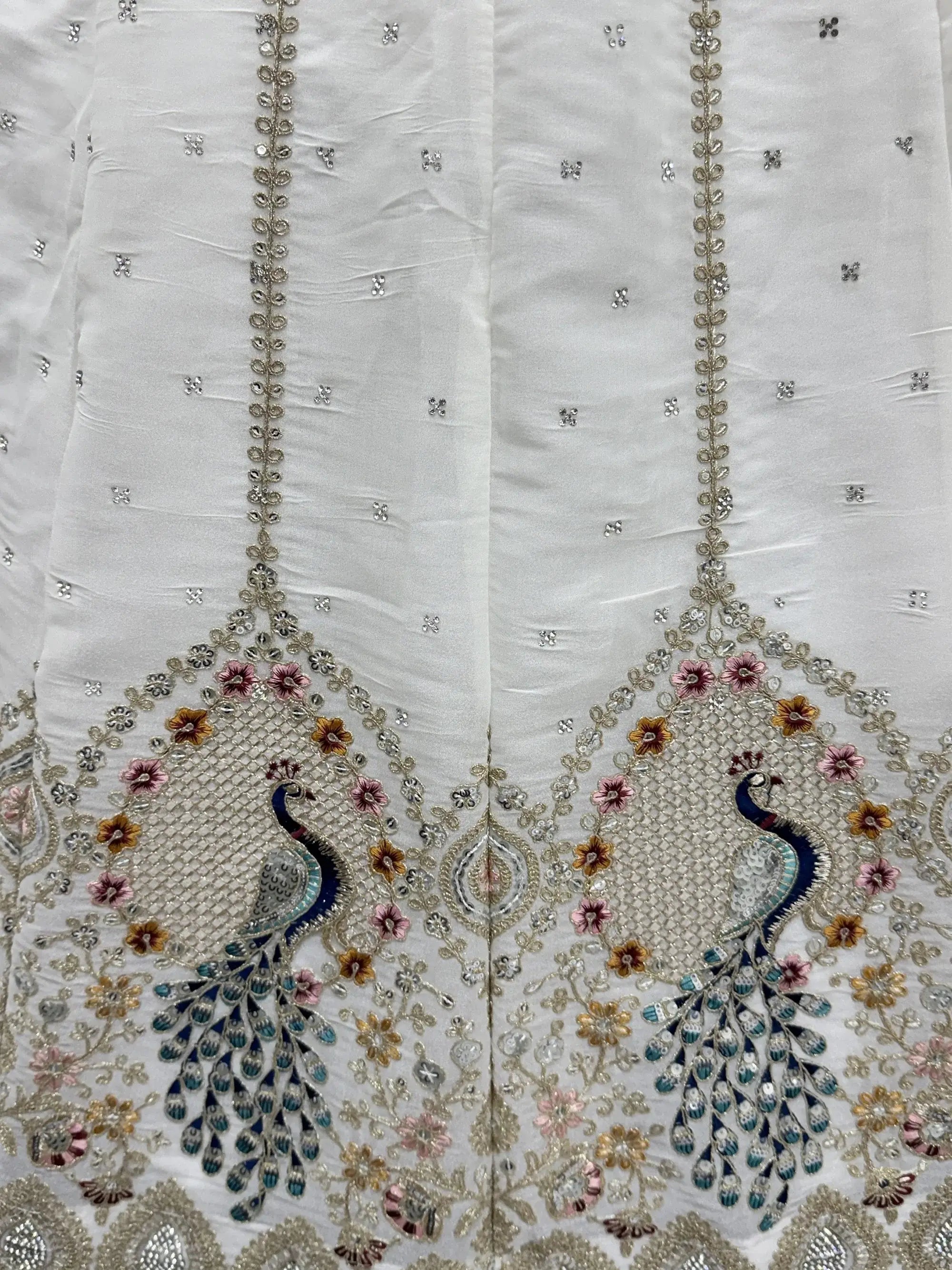 These images showcase a stunning white Gadhwal silk lehenga adorned with rich peacock embroidery. The detailed dori work, sequins highlights, and zircon diamond embellishments create an elegant and festive appeal.