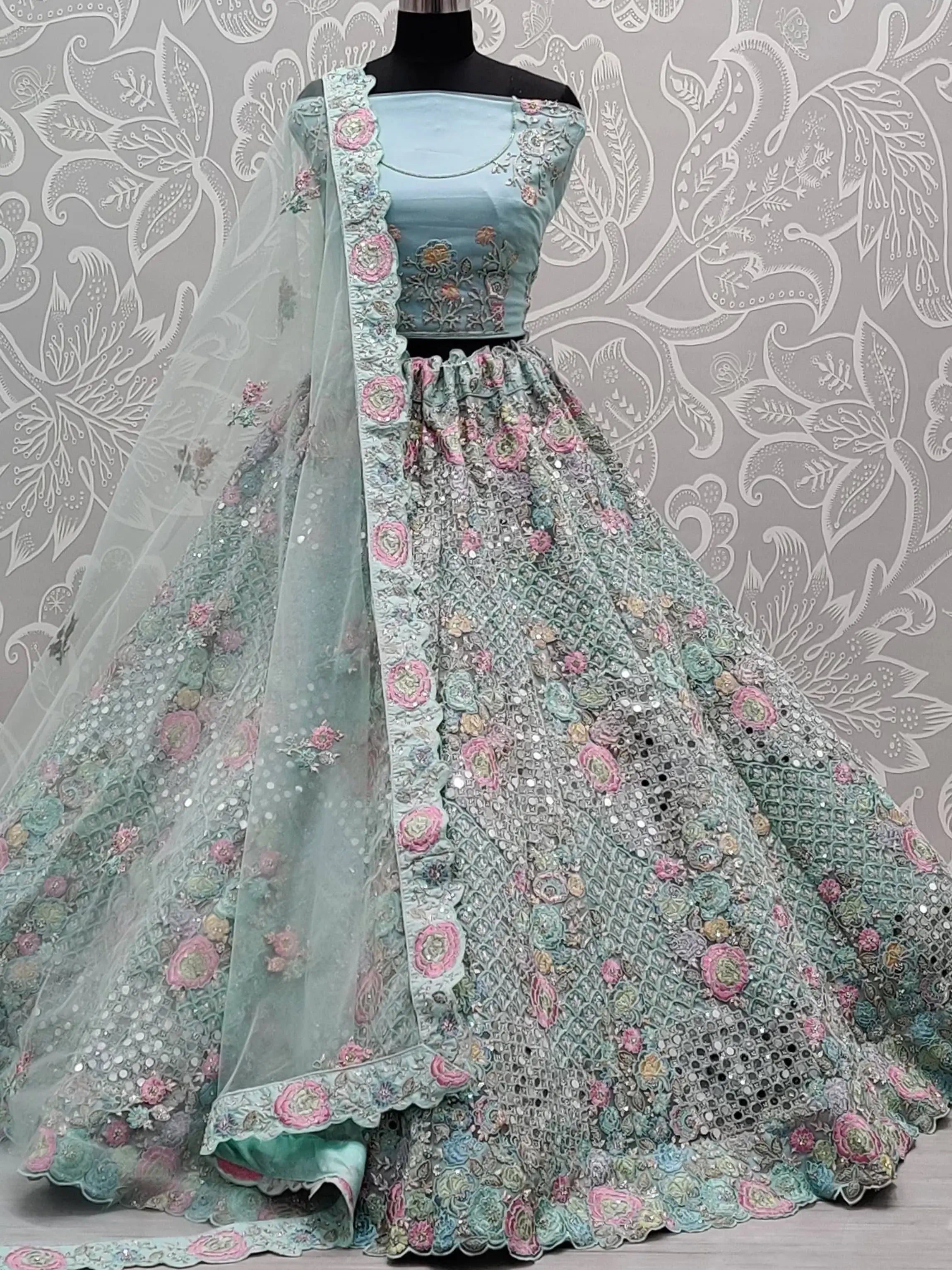 This lehenga comes with similar color choli in heavy net material with sequins, dori, mirror, and multi-thread embroidery work and a similar color soft net dupatta come with border multi-thread, mirror, and sequins work butties all over.
