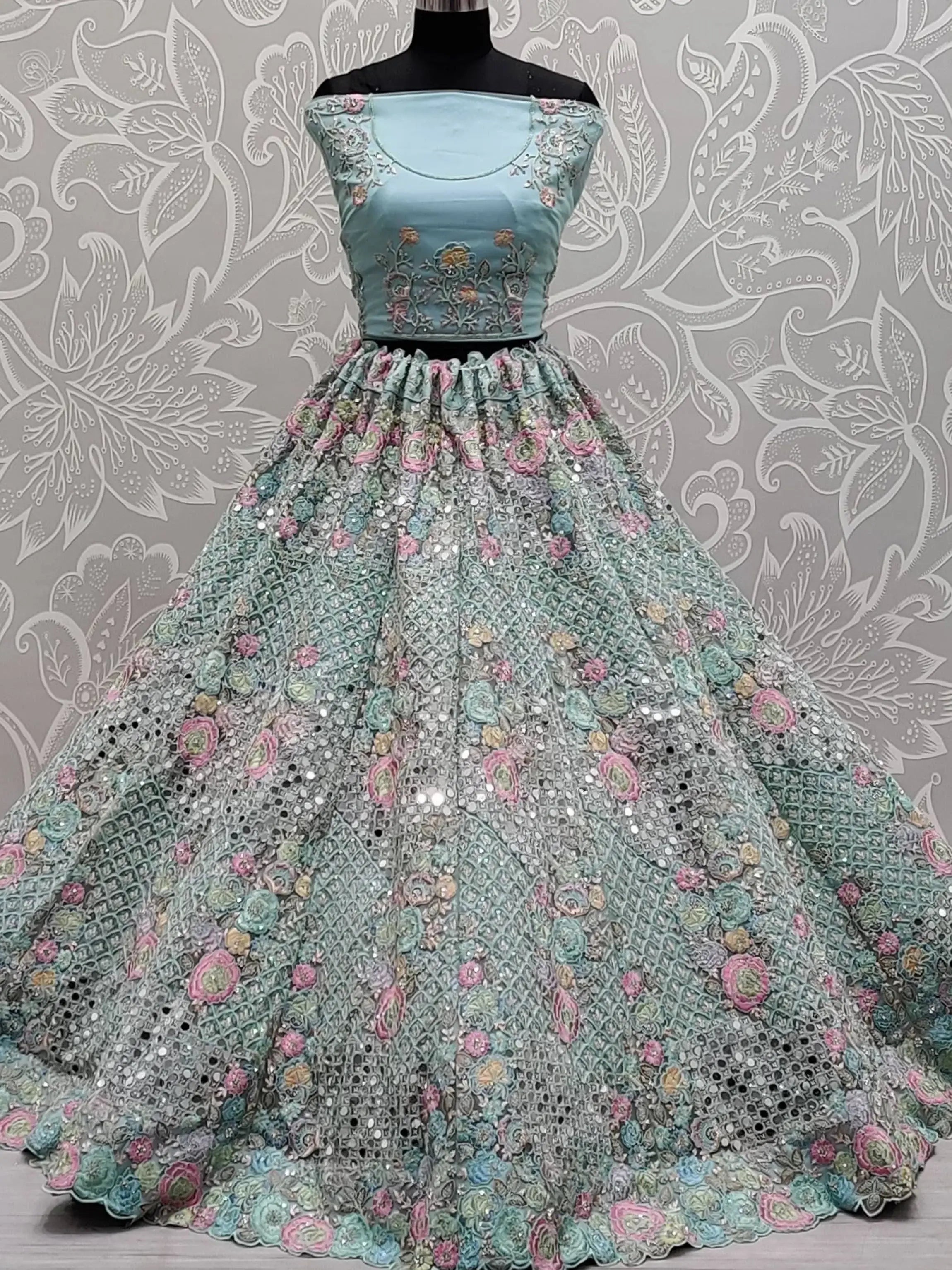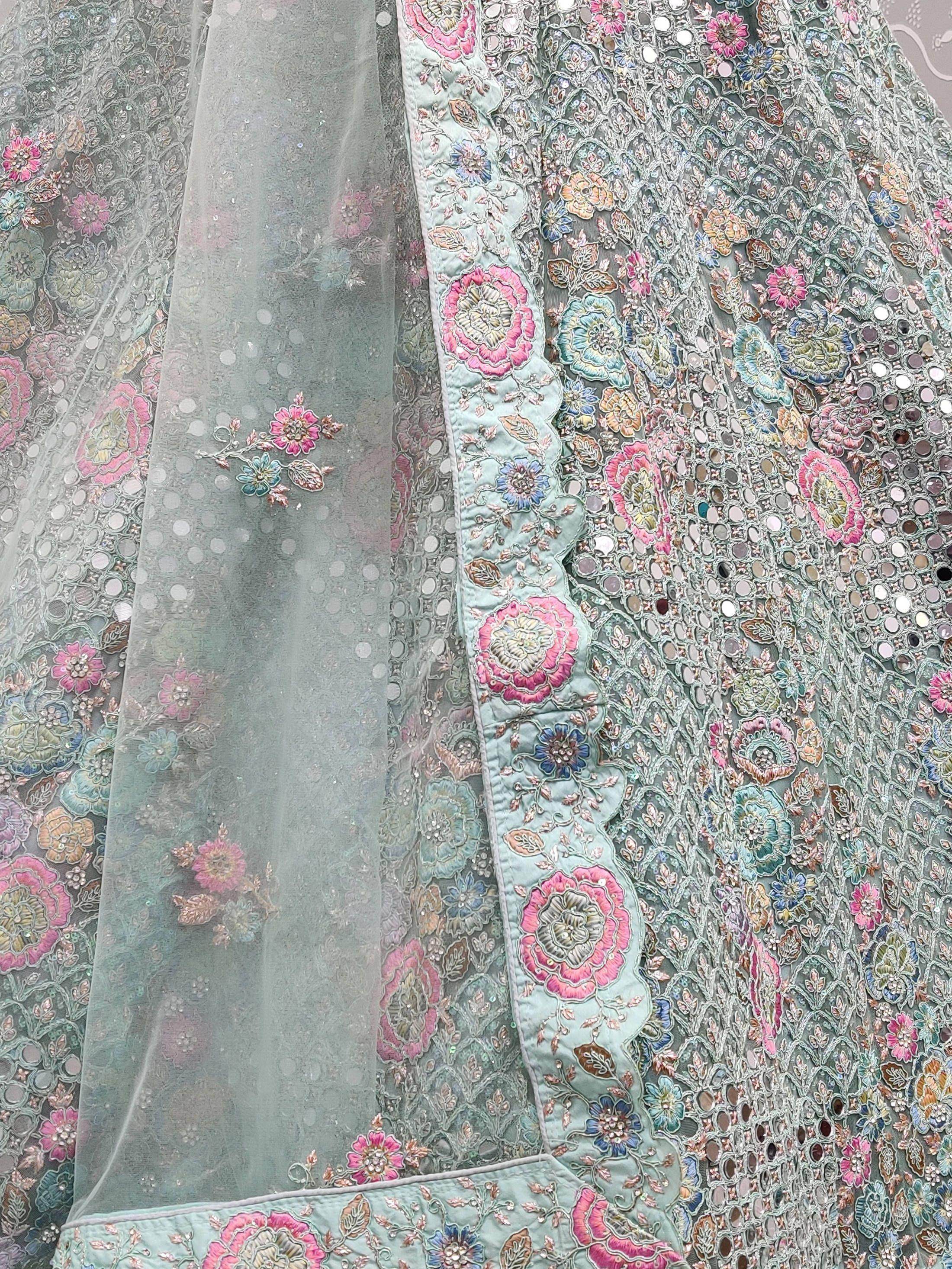 Create an opulent effect with your fashion sense by wearing this elegant blue lehenga made of heavy net material embellished with sequins, dori, mirror, and multi-thread embroidery work all over featured with attached can-can and canvas.
