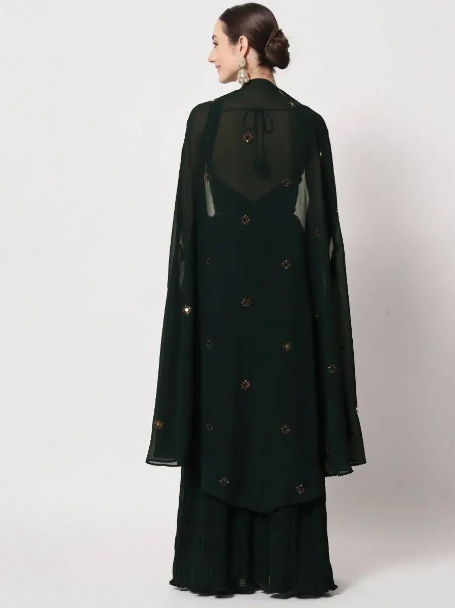 Pairing with dark green color choli in green color with fancy hem cut and beautified by thread embroidery, sequines and mirrors with fluant with green similar color shrug.