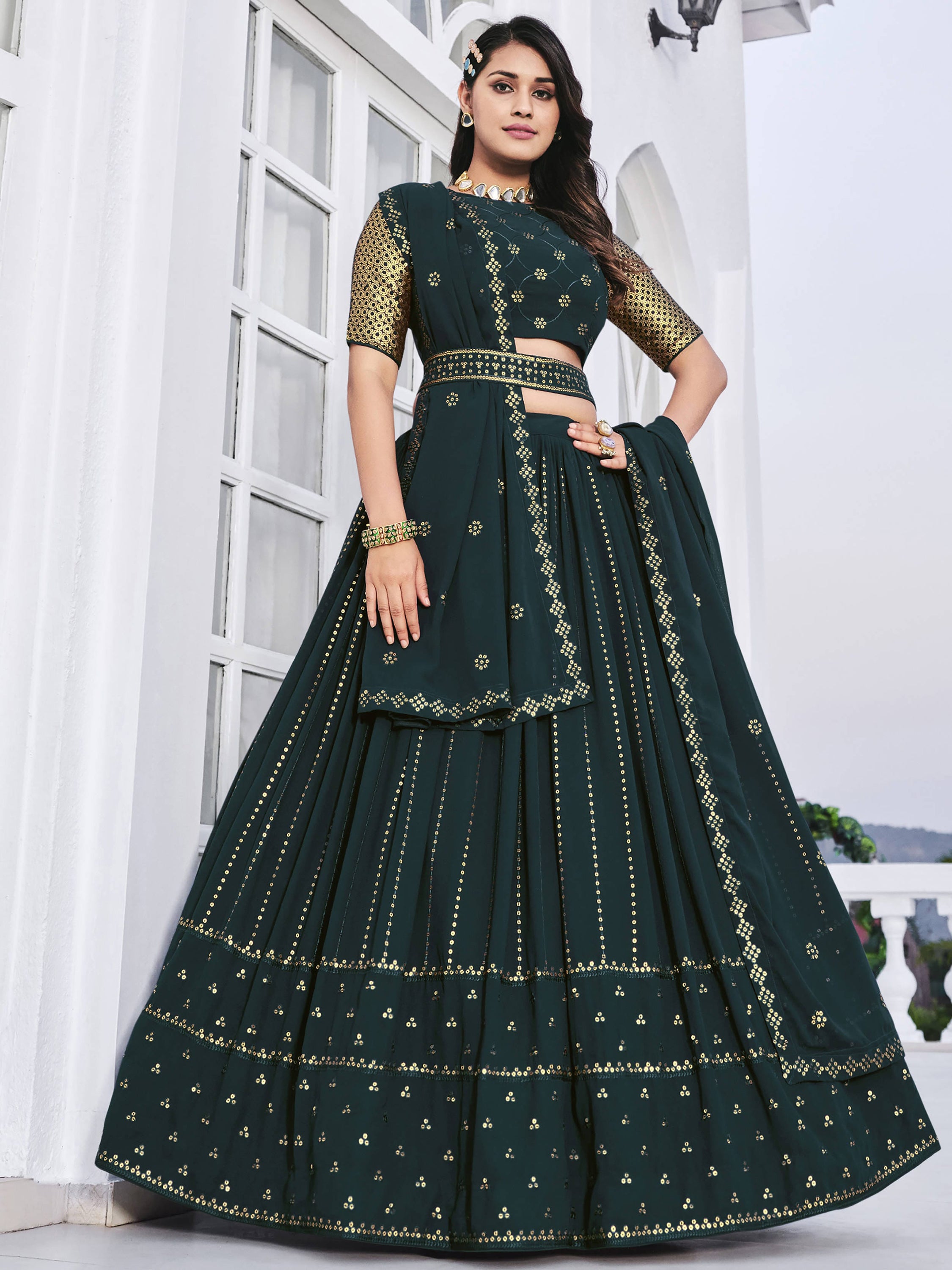 Team it with stylish accessories to elevate your looks with this classy dark green georgette party wear lehenga.