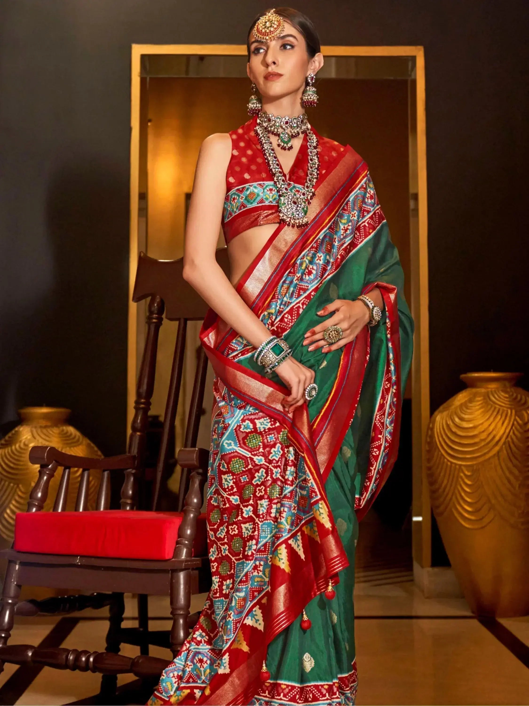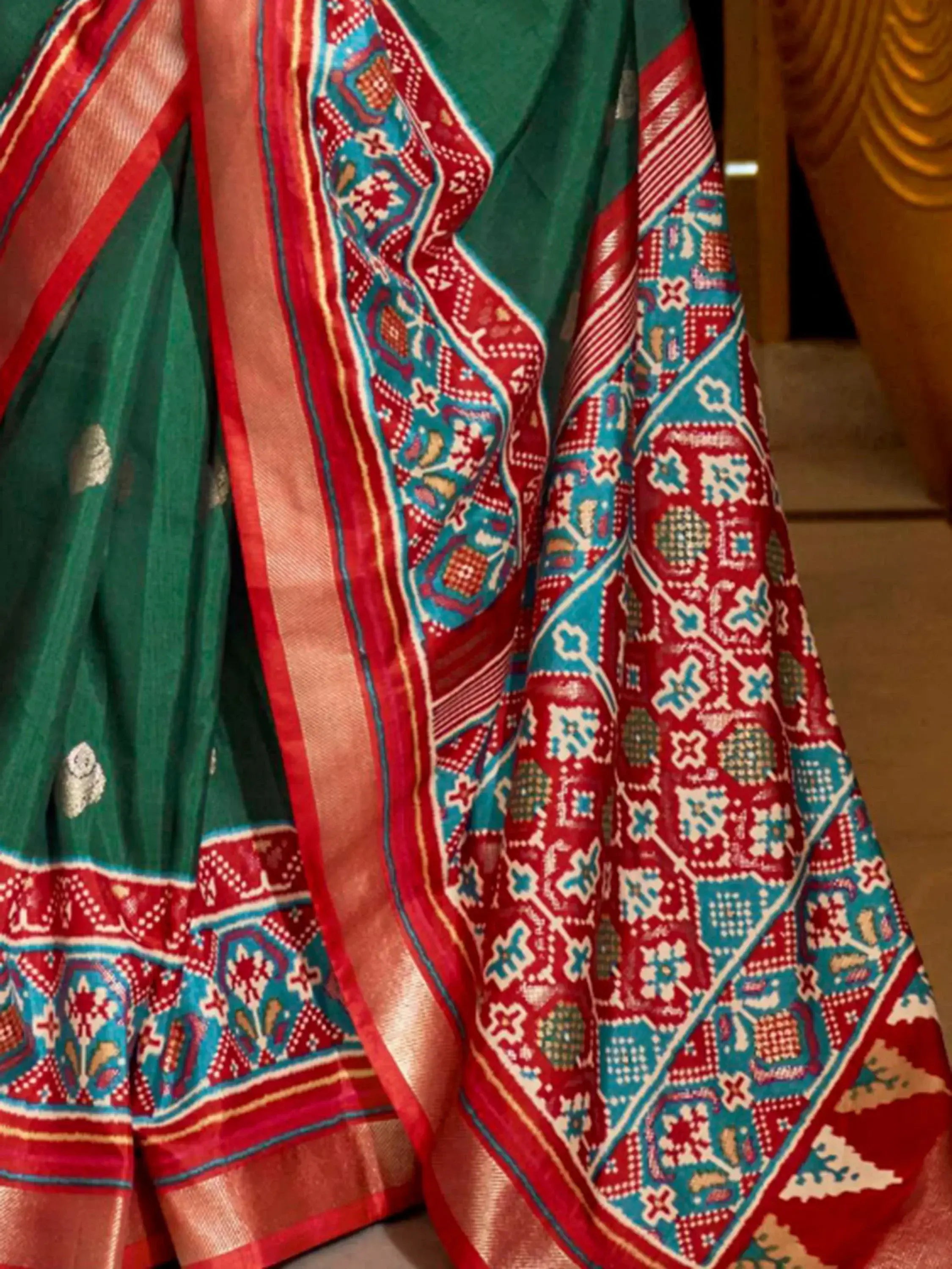 Accompanied by a red blouse featuring patola design and elegant gold print, this ensemble is crafted from luxurious silk material. The blouse's rich colors perfectly complement the dark green saree, enhancing its overall appeal.
