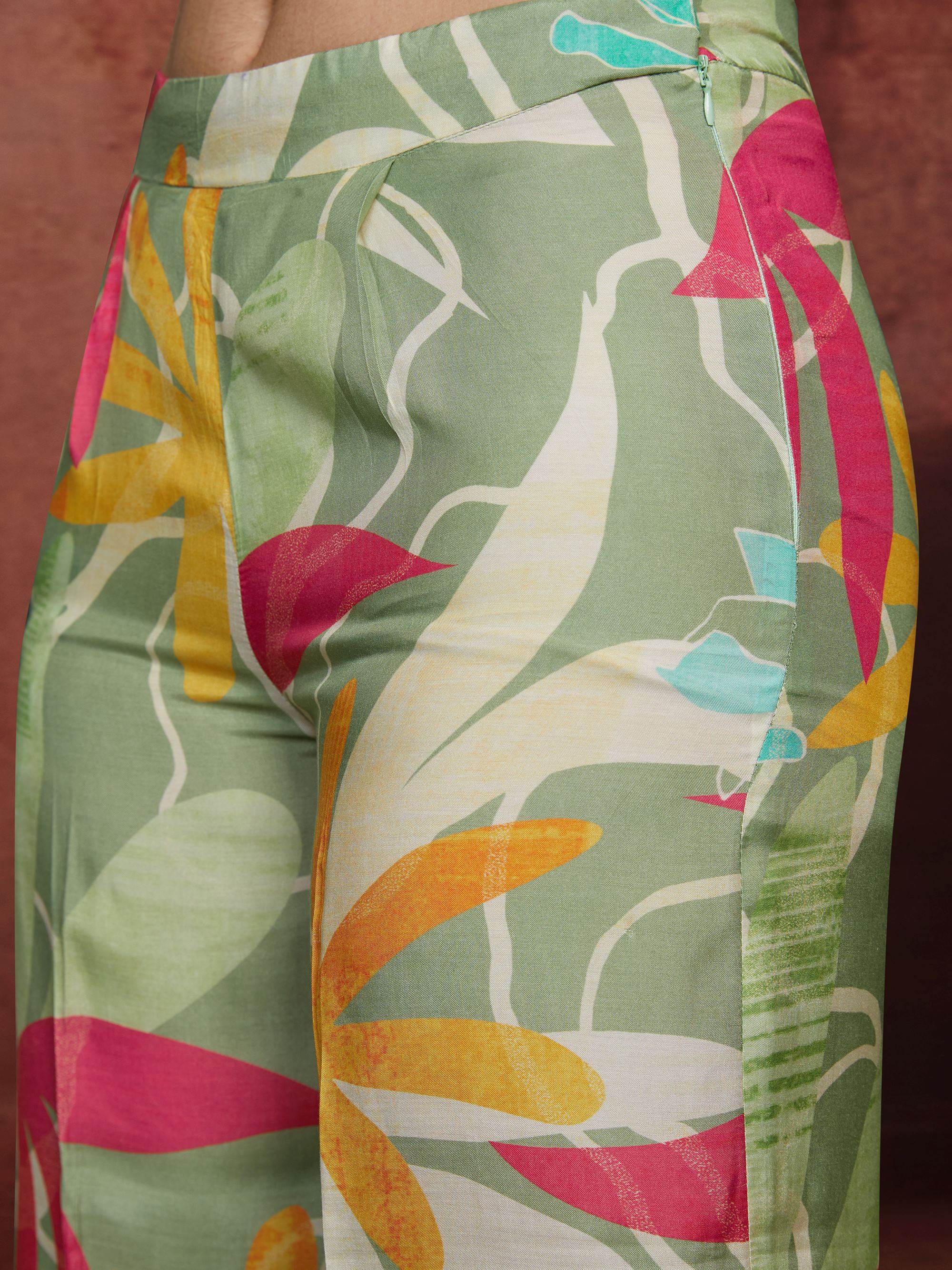 The green co-ord set features a vibrant digital print on soft muslin silk, showcasing bold florals and abstract patterns in lively hues. The fabric drapes gracefully, giving the outfit a luxurious yet lightweight feel, perfect for effortless styling.
