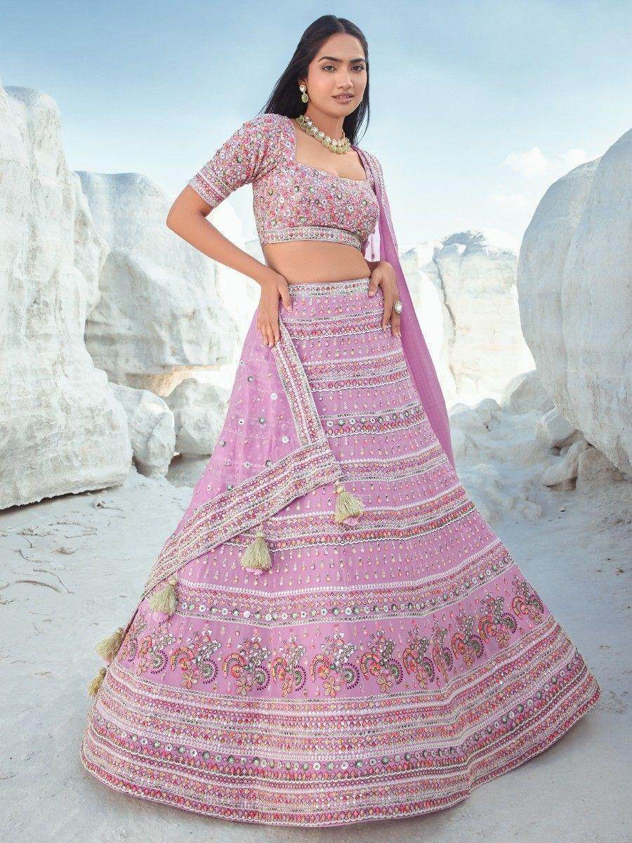 This fabulous lavender lehenga choli is the epitome of elegance and is perfect for weddings, receptions, engagements, and other special occasions. Its stunning lavender color will make you stand out, while the sequin work and thread embroidery add a touch of sophistication. The A-line silhouette enhances your figure, accentuating your natural beauty.