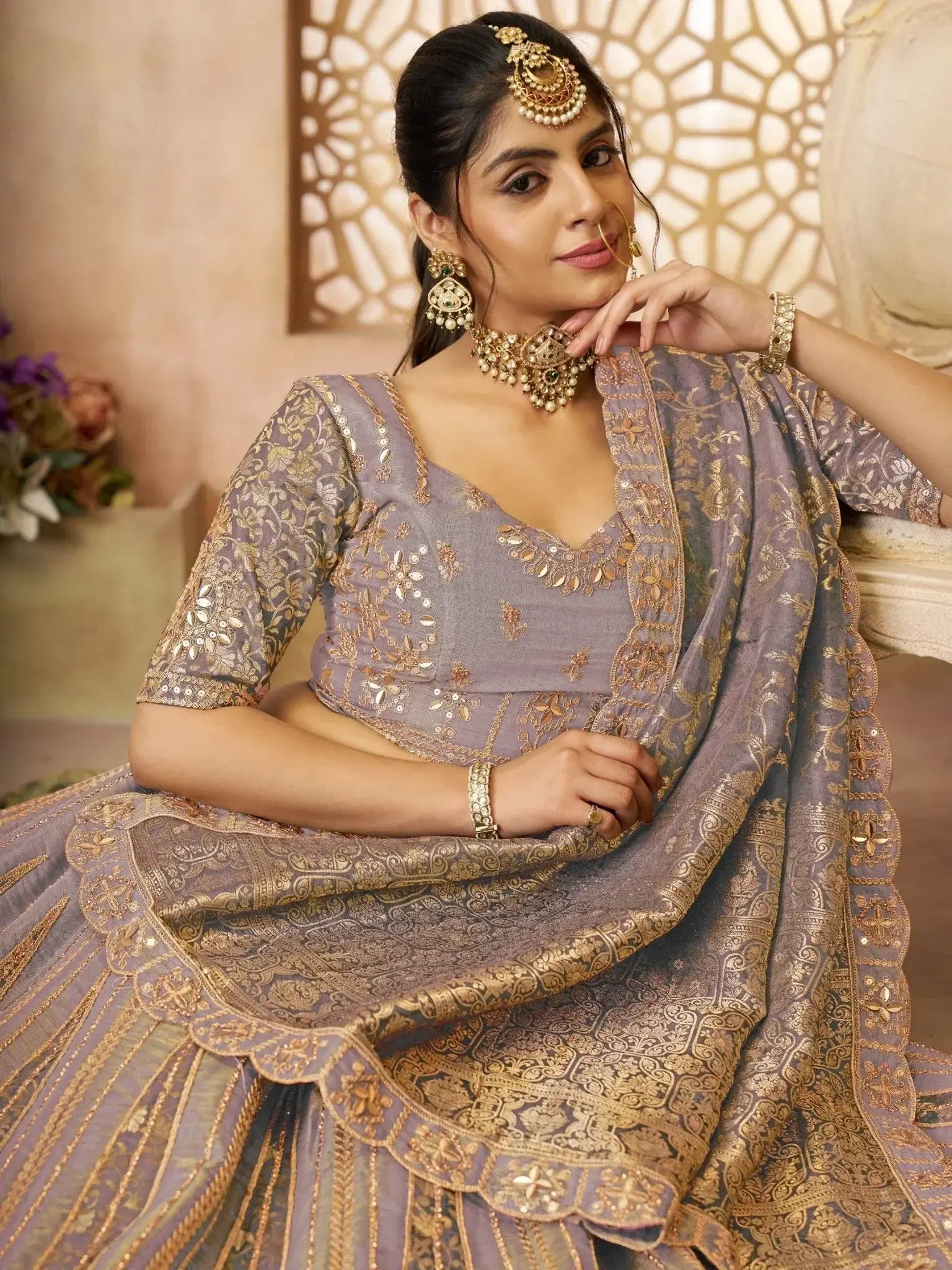 Add a touch of dreamy elegance to your special occasion with this gorgeous lilac tissue silk bridesmaid lehenga choli set. Crafted from lightweight tissue silk, the lehenga offers a soft, sheer texture with a natural metallic shine that beautifully catches the light. The lilac shade brings a romantic, graceful charm that's perfect for bridesmaids and festive celebrations.
