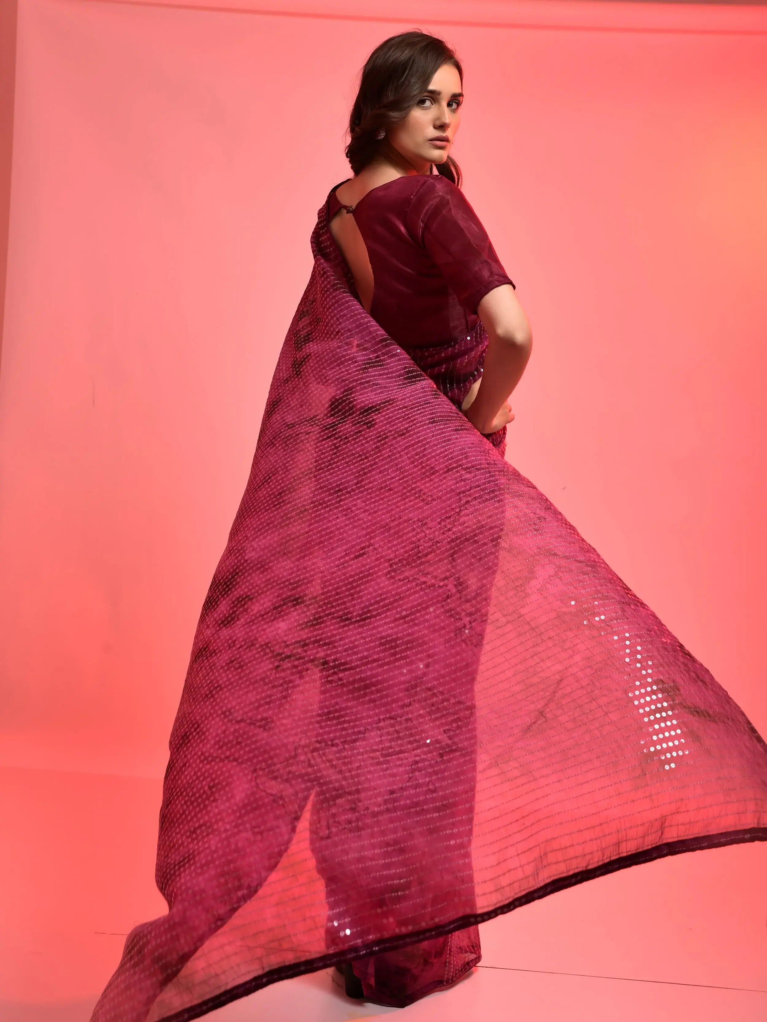 This magenta saree radiates elegance with its sheer fabric and subtle shimmer. The sequin stripes add a graceful sparkle, perfect for festive or evening occasions.