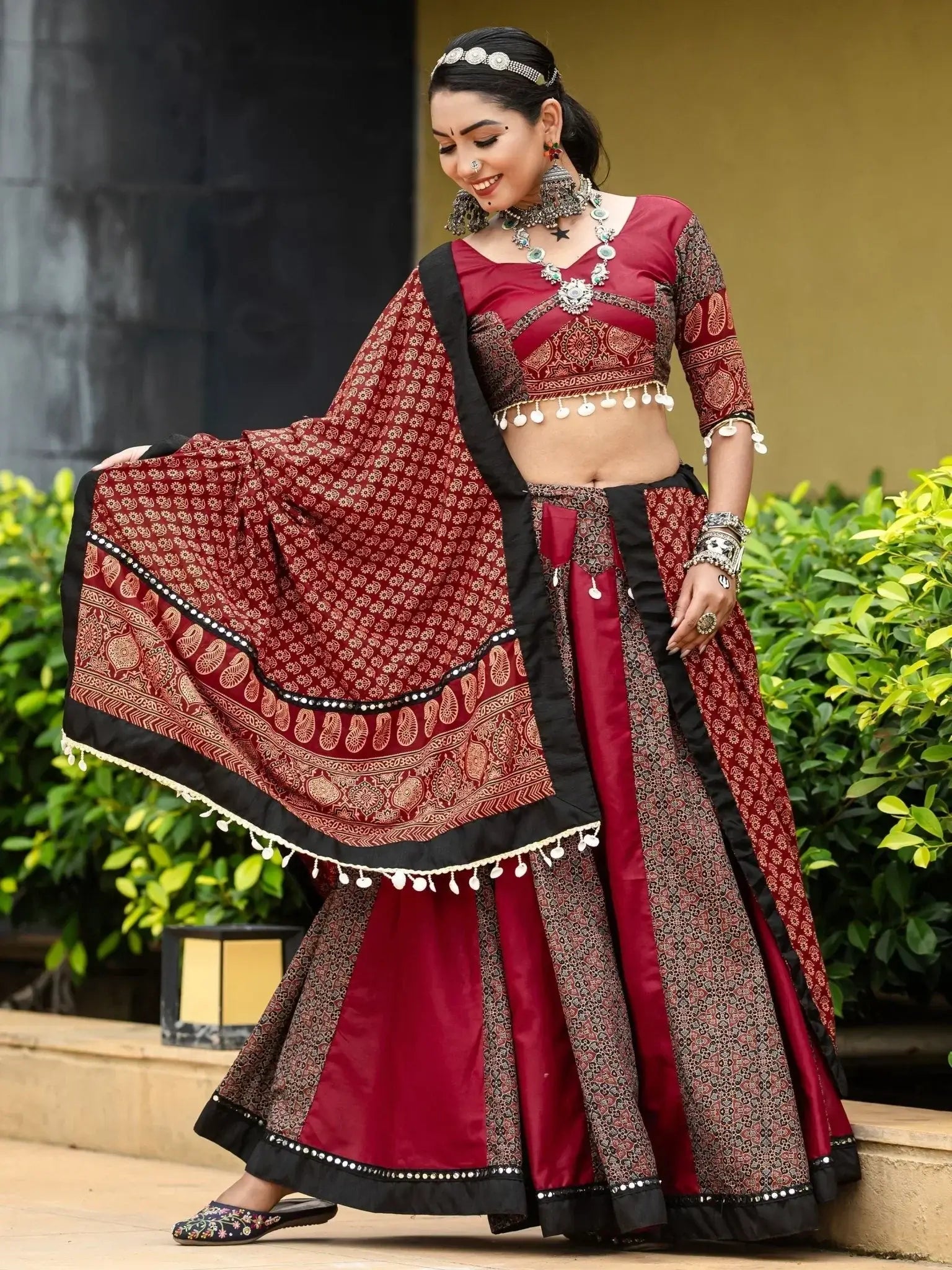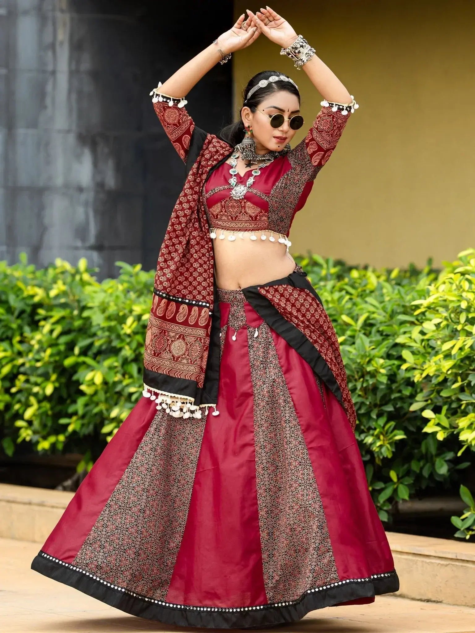 The gorgeous maroon printed cotton navratri lehenga choli from ethnic plus is a vibrant choice for festive celebrations. This lehenga is crafted in a rich maroon color, and beautifully adorned with intricate kodi work, mirror work, and lace detailing. The lehenga features a flattering flair of 6 meters, adding a graceful touch to your look.