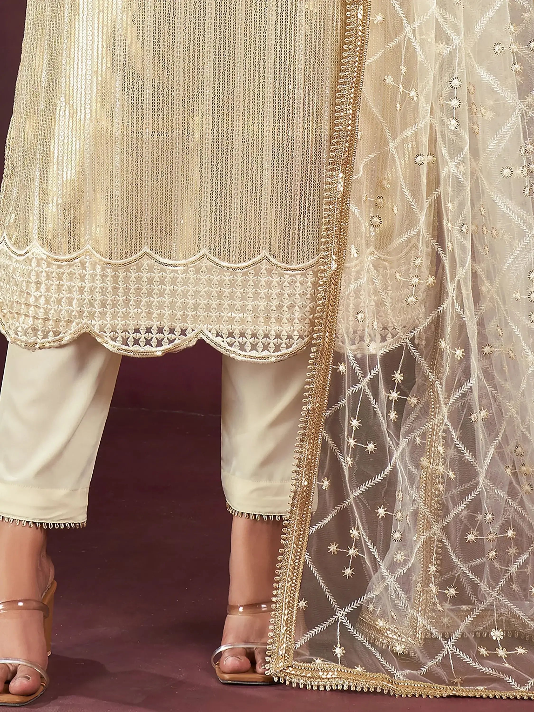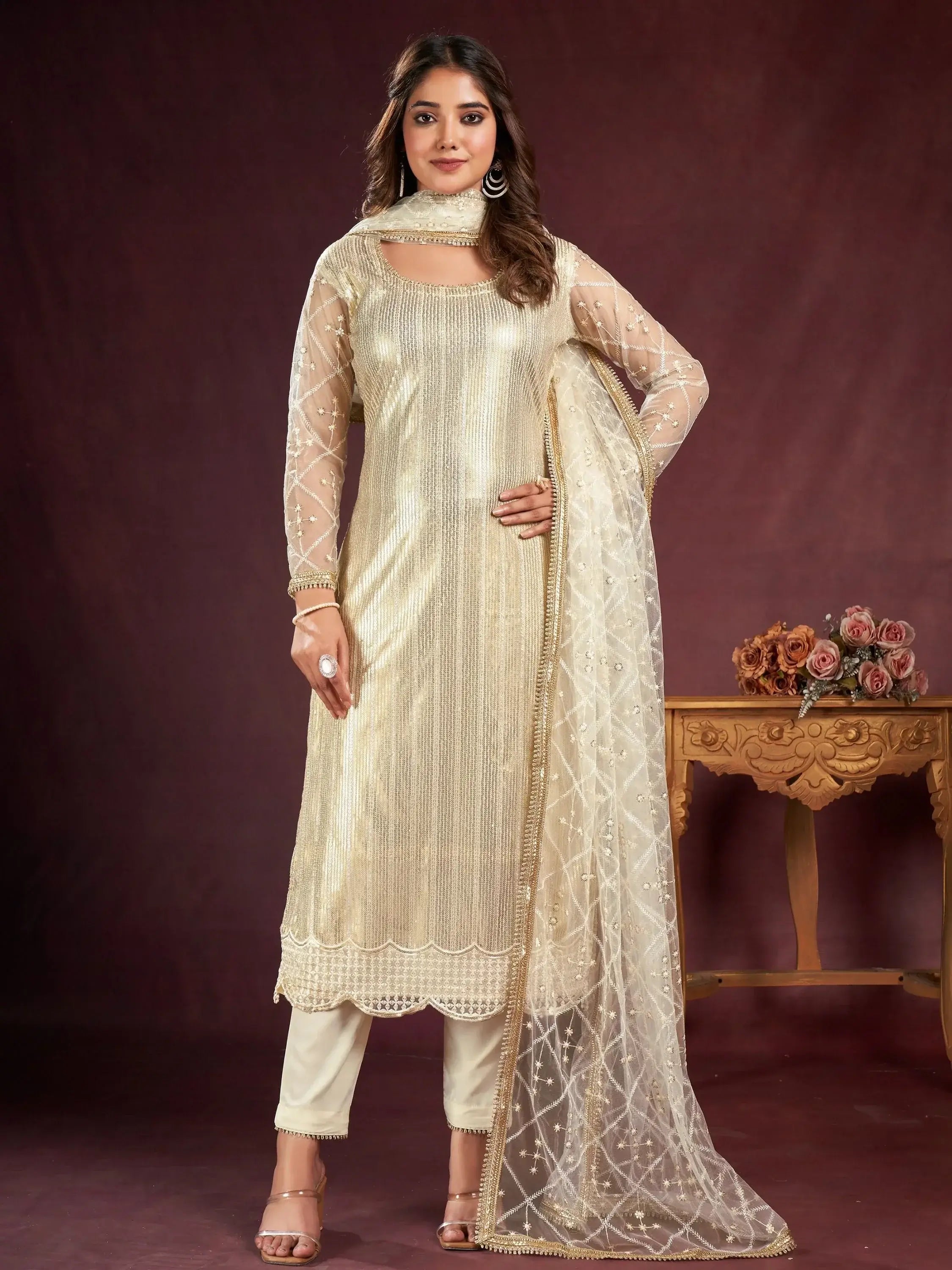 Presenting an exquisite off-white net kameez adorned with intricate threadwork, sequin detailing, and a fancy readymade lace border for an elegant touch. Paired seamlessly with a crepe salwar in a matching off-white shade, this ensemble exudes timeless sophistication and style.