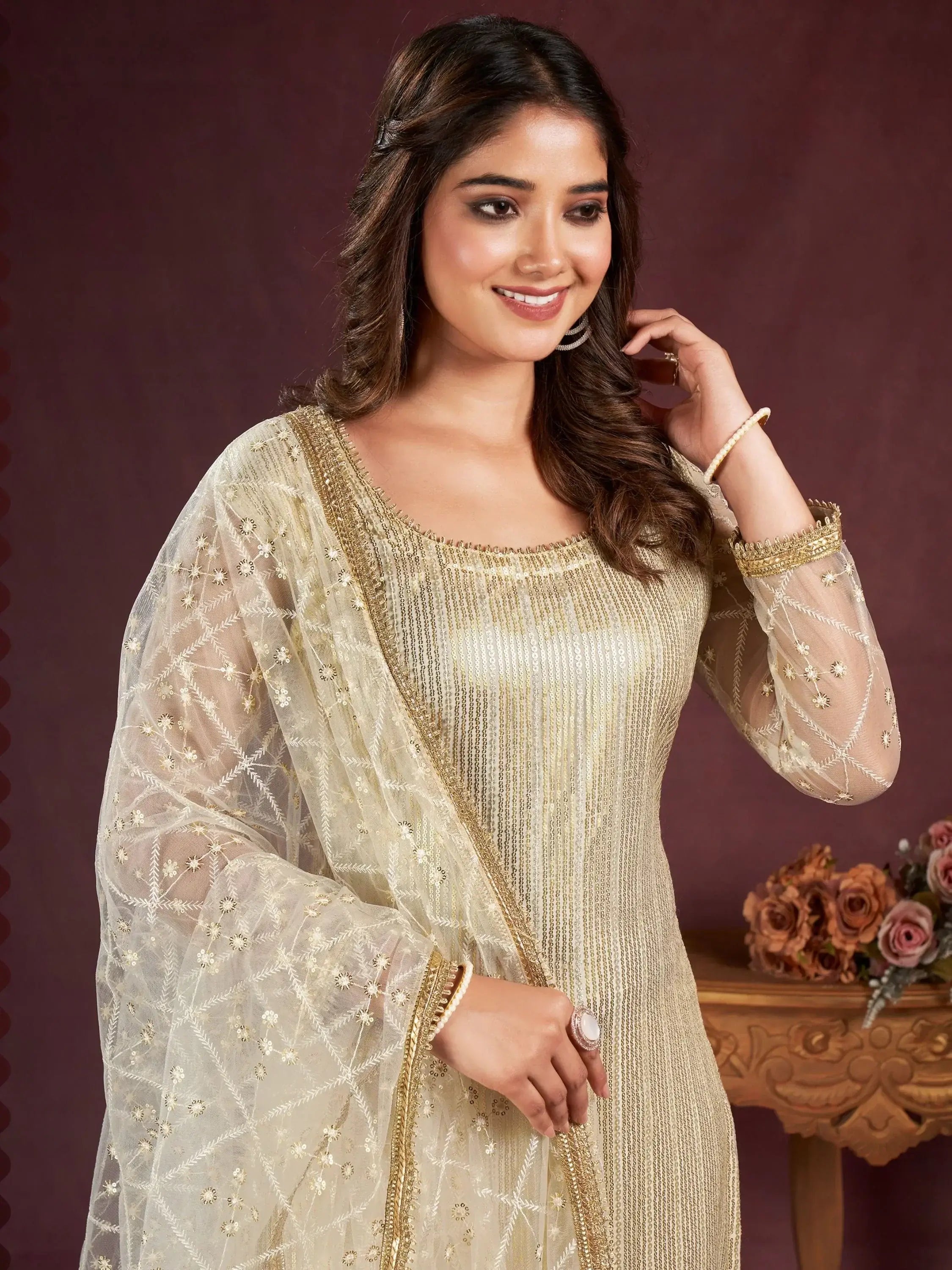 This off-white salwar kameez is the perfect choice for upcoming festivals and family occasions, where you aim to be in the limelight. Elevate your presence with this intricately crafted ensemble, and make a statement at every celebration.