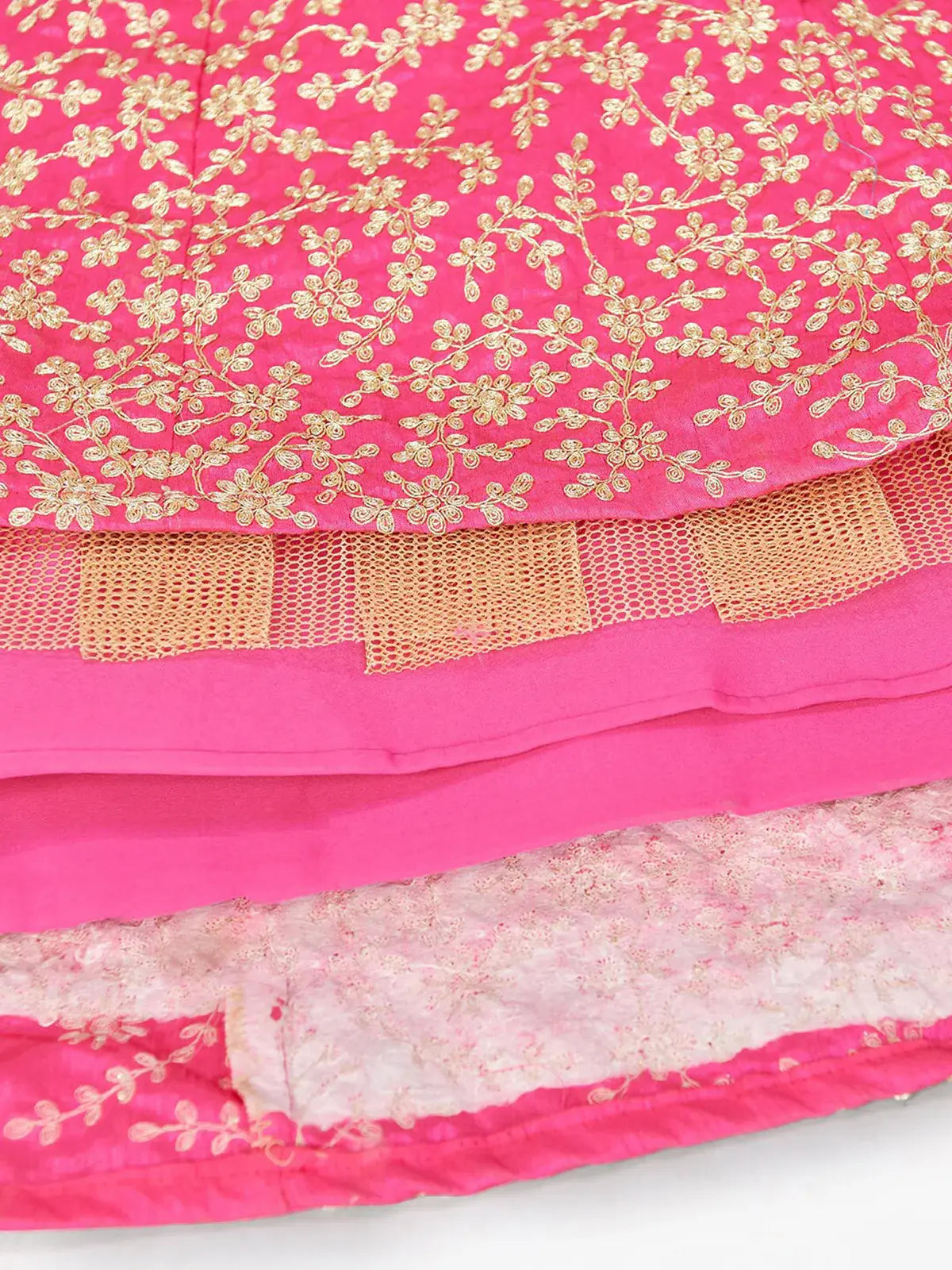 This stunning hot pink lehenga set beautifully combines traditional charm with modern vibrance. The semi-stitched soft net lehenga is adorned with intricate zari and sequin embroidery, creating a dazzling all-over floral pattern. With a 3.50-meter flair, it exudes a grand and regal presence, perfect for weddings and festive occasions.