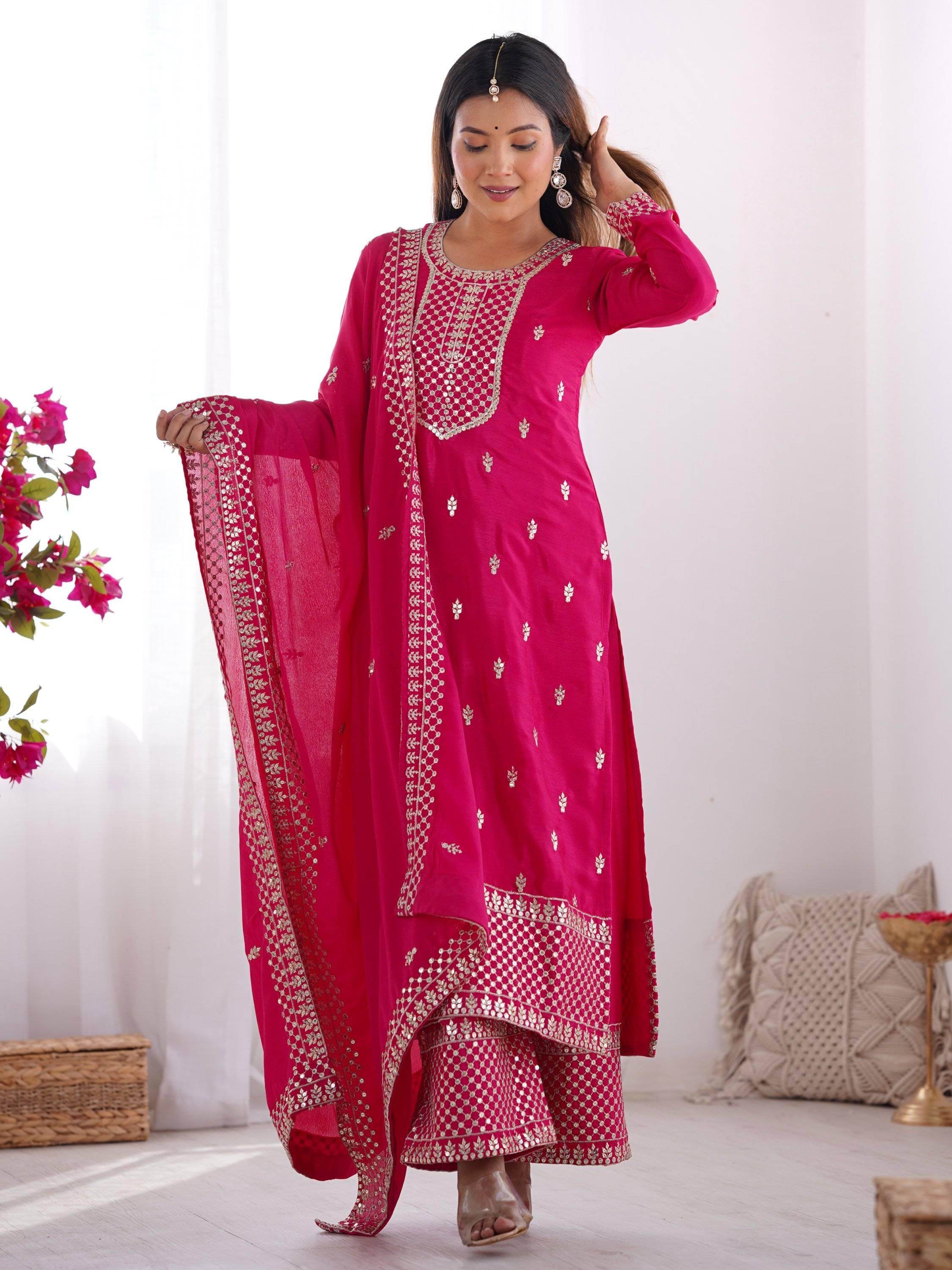 The set comes with a matching pink chinon palazzo, beautifully finished with a similarly embroidered border that complements the top flawlessly. The wide-leg palazzo style offers both comfort and flair, making it ideal for long celebrations without compromising on style. The subtle shimmer of the embroidery elevates the overall look, giving the ensemble a cohesive and elegant finish.