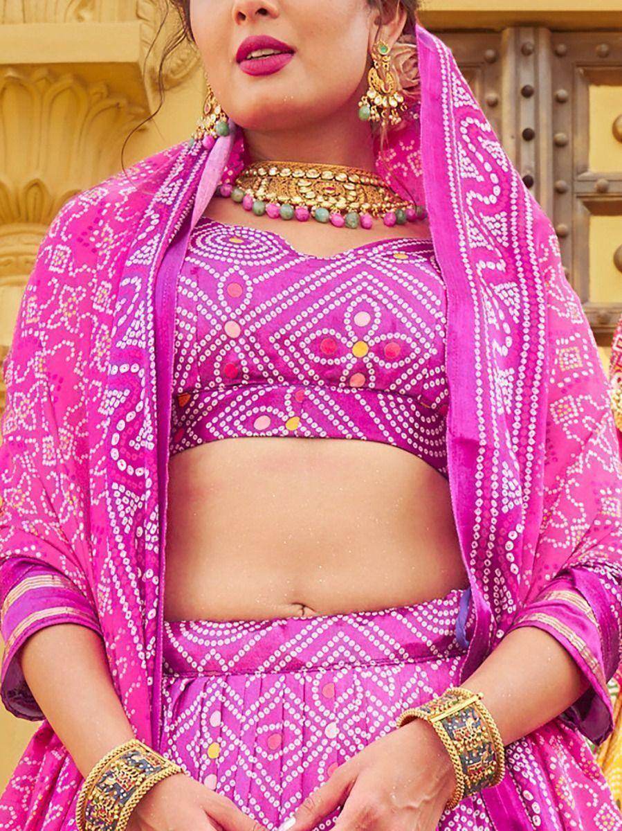 Simplicity has its charm and grace when women keep their style with this superior purple color bandhani digital printed designer lehenga which is made up of pure gaji silk material and also attached with a double layer of canan & canvas.
