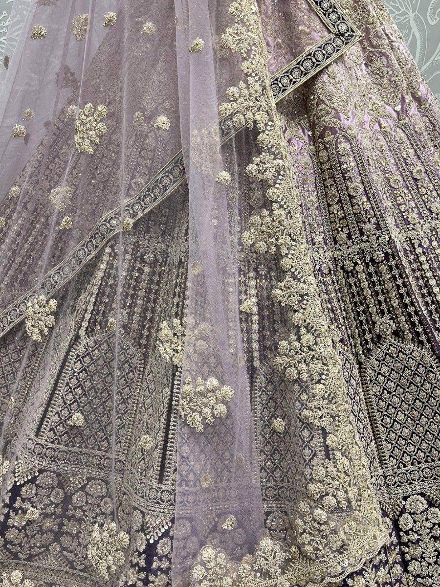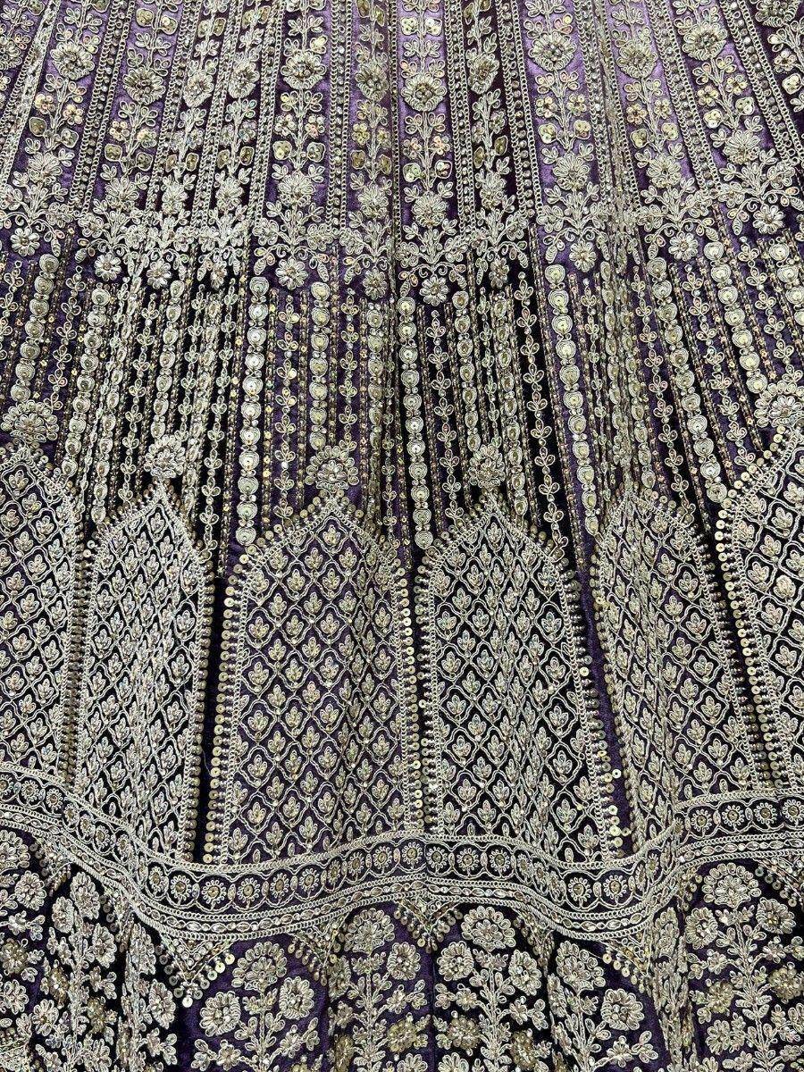 This stunning bridal lehenga is crafted from a luxurious velvet material in a beautiful purple color. It features intricate embroidered work that adds a touch of elegance and sophistication. The fancy dori work, multi-thread work, sequin work, and diamond work further enhance the beauty of this lehenga, making it a true masterpiece.