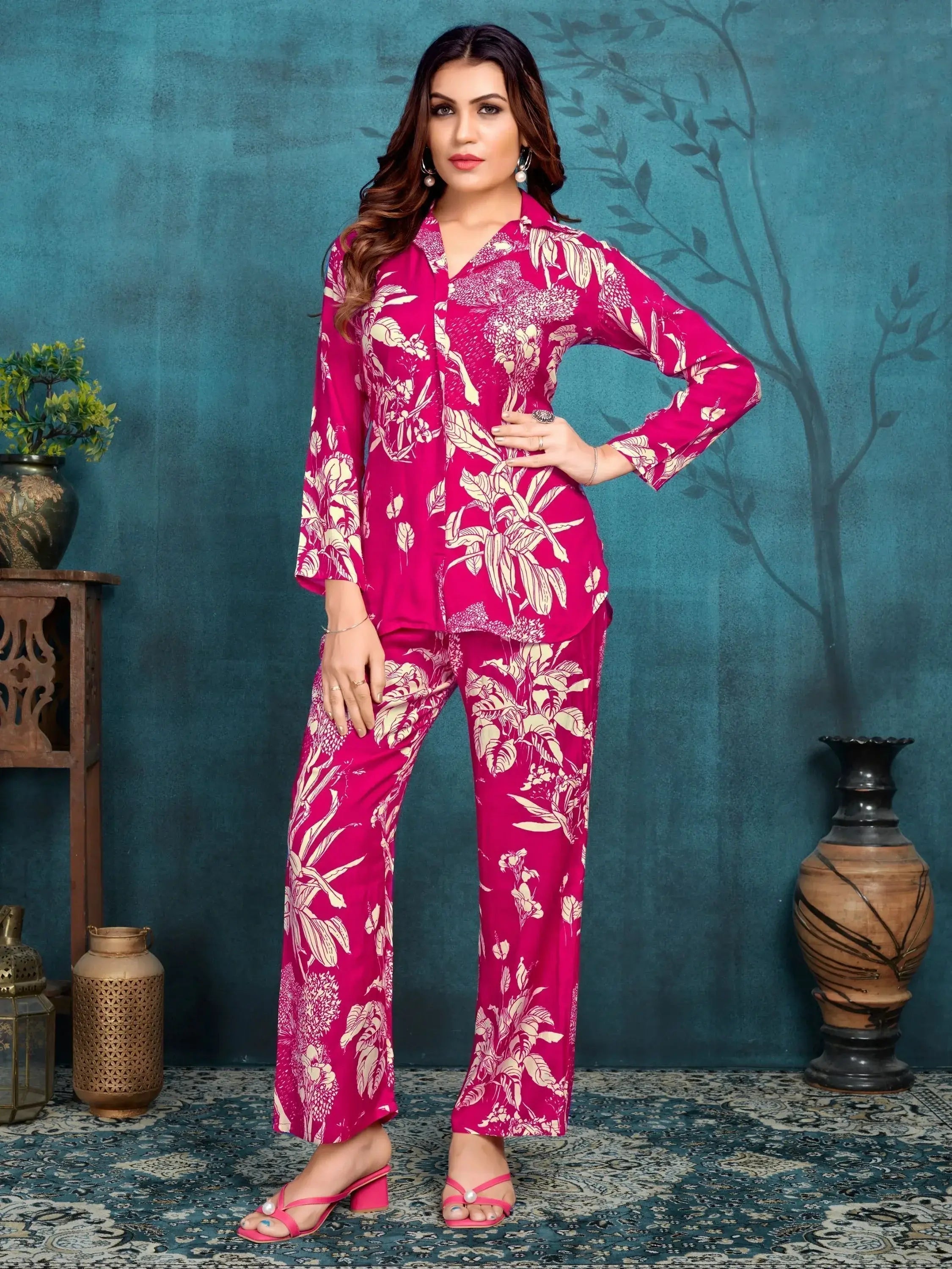 Our stunning "gorgeous rani pink digital printed muslin silk casual wear co-ord set", is a must-have addition to your wardrobe for the upcoming festive season. Made from high-quality muslin silk material, this pantsuit features intricate digital printed work that adds a touch of elegance and sophistication to your look. The set includes a matching pair of muslin silk pants with digital printed work, creating a coordinated and stylish ensemble that is perfect for special occasions.