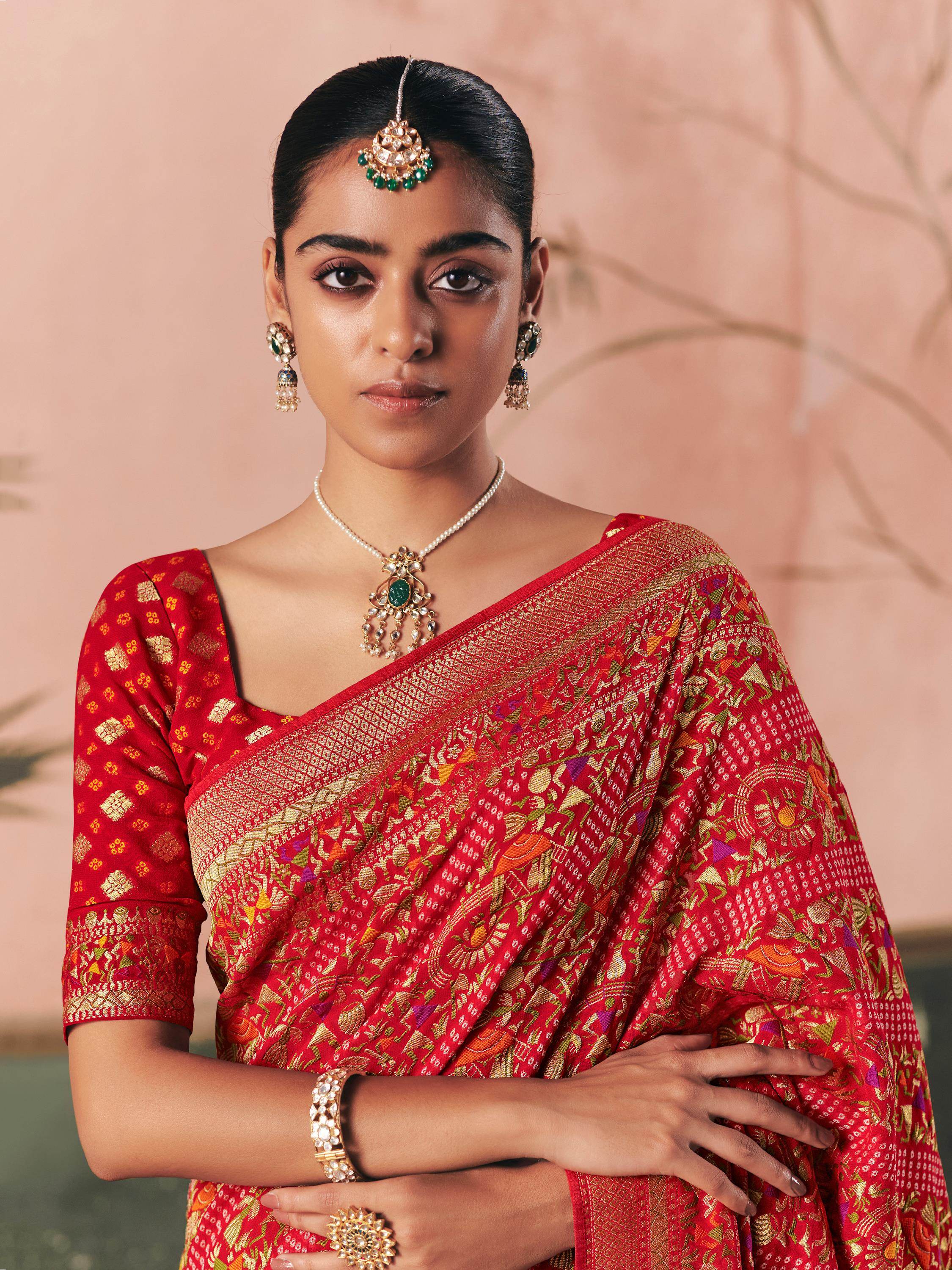 The luxurious silk fabric drapes gracefully, enhancing every movement with its soft shine. Its 5.5-meter length allows for a flawless pleating and pallu drape that looks stunning from every angle.