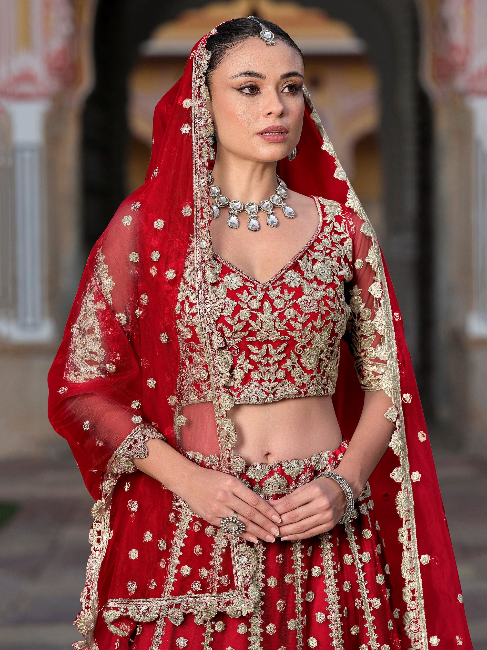 The semi-stitched soft net red lehenga is intricately adorned with zari and sequins embroidery, creating a royal aesthetic perfect for weddings and grand celebrations. Its heavy floral and vine motifs add timeless elegance and a majestic flair.
